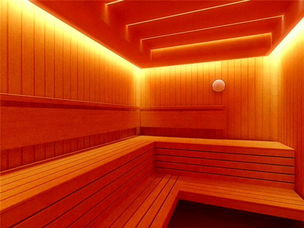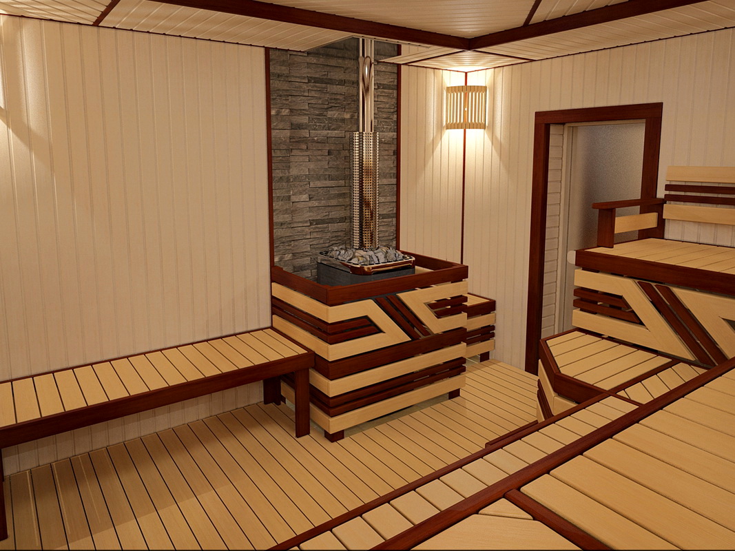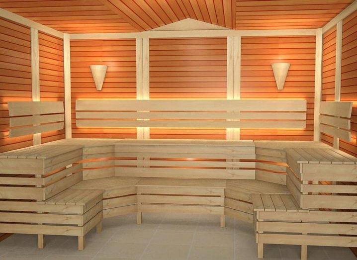 Pour rendre l'intérieur plus expressif, il convient de souligner la surface des étagères, les contours des portes et le périmètre du plafond avec des lamelles d'une teinte plus foncée, en se concentrant sur la géométrie des formes. Et l'éclairage, équipé de lampes dans les coins ou de certaines rayures, créera une atmosphère intime et charmante dans le hammam.