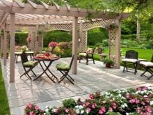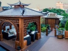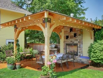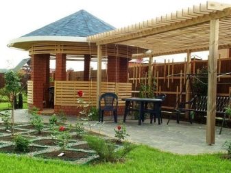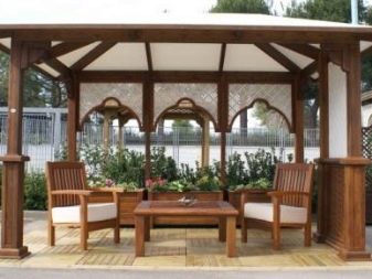Par exemple, vous pouvez ajouter un petit pavillon à un belvédère couvert. Cela le rendra plus fonctionnel, placez un meuble mobile sous la forme d'une table avec des chaises au sol devant l'entrée. Il est possible de compléter une telle plate-forme avec un auvent couvrant les utilisateurs des rayons brûlants du soleil. Il sera donc possible de créer une zone de loisirs supplémentaire pour résoudre le problème de congestion lié à la cuisson dans le belvédère. Pour plus de commodité, vous pouvez effectuer des dalles de sol.