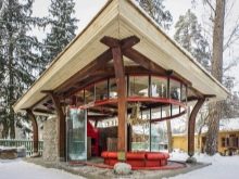 Un tableau aura l'air plus expressif de l'intérieur si vous combinez un arbre avec une autre texture. Par exemple il est possible de recouvrir les murs, dans la version ouverte, de sculpter la balustrade, de la forger de dentelle, de réaliser le toit d'une tuile en métal. Un seul arbre, même sous une forme brute, est loin d’être apprécié de tous, car l’inhabitabilité interne délibérément créée de nombreuses personnes crée un malaise, même si la maison privée elle-même est fabriquée dans les traditions russes. Si le matériau n'est pas prévu pour le gainage, vous pouvez le peindre dans une couleur claire.. Cela supprimera le sentiment de lourdeur.