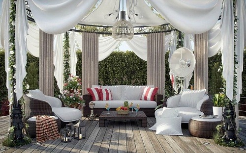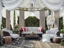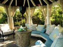 L'intérieur du belvédère à la campagne ou la parcelle d'une maison de campagne peuvent être aménagés dans un style différent. Les projets les plus réussis sont les options dans le style d'un chalet, la Provence, le minimalisme et le classique.. L'arrangement dépend des habitudes et des goûts du ménage. Par exemple, dans un cas, l’accent est nécessairement mis sur la simplicité, la présence de textiles et les couleurs claires du mobilier, sa légèreté et ses fleurs fraîches.Il est possible d'installer des meubles en plastique à l'intérieur, imitant le rotin et même le cuir.