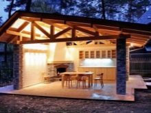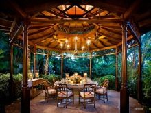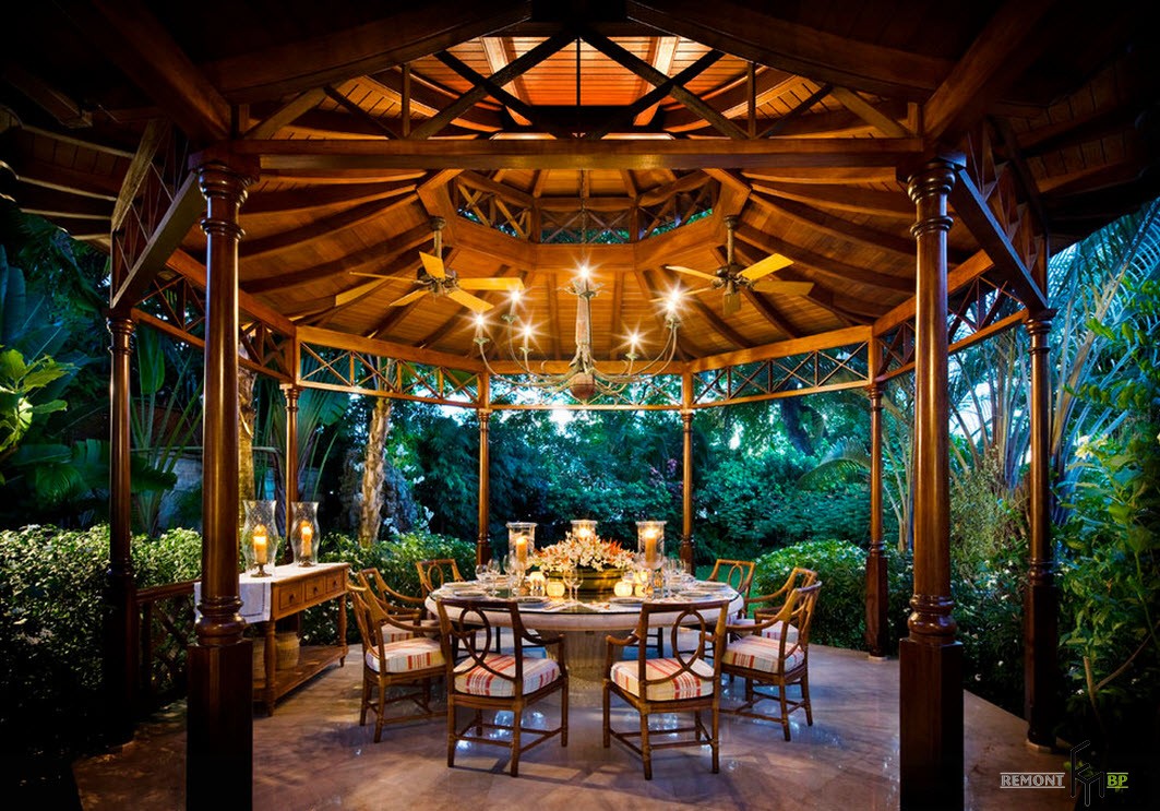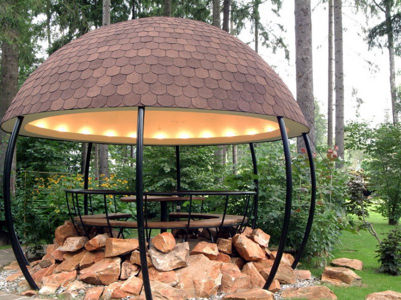 Pour plus de confort, vous pouvez désigner des zones fonctionnelles séparées avec un éclairage séparé, ce qui vous permettra d'ajouter une organisation discrète à l'espace. En même temps, dans la tonnelle, vous pouvez installer un bar.