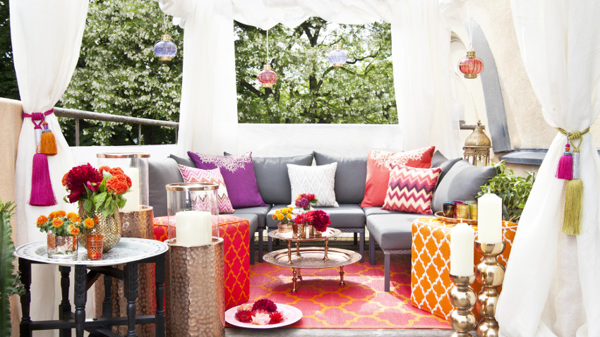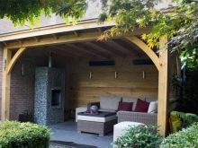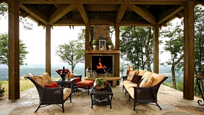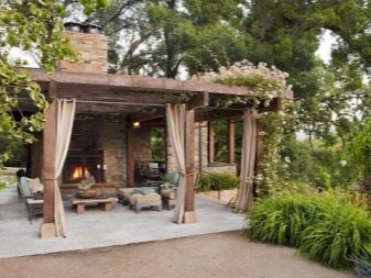 - Beau design pour un coin confortable du jardin. La présence d'une cheminée et de rideaux traduit l'atmosphère de la maison.