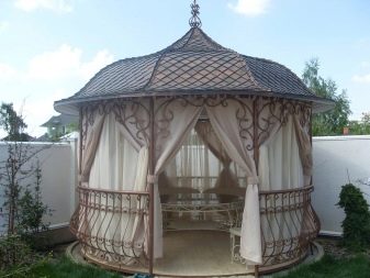 Les gazebos Metraz et leurs formes peuvent être différents, ce qui affecte leur fonctionnalité et le placement des éléments de l’arrangement.Par exemple, un belvédère rond peut servir à boire du thé et consiste à placer une table au centre et des chaises autour. Si vous le souhaitez, vous pouvez créer une petite serre de fleurs à partir d’un tel bâtiment, décorer avec des pots de fleurs et jardiner.