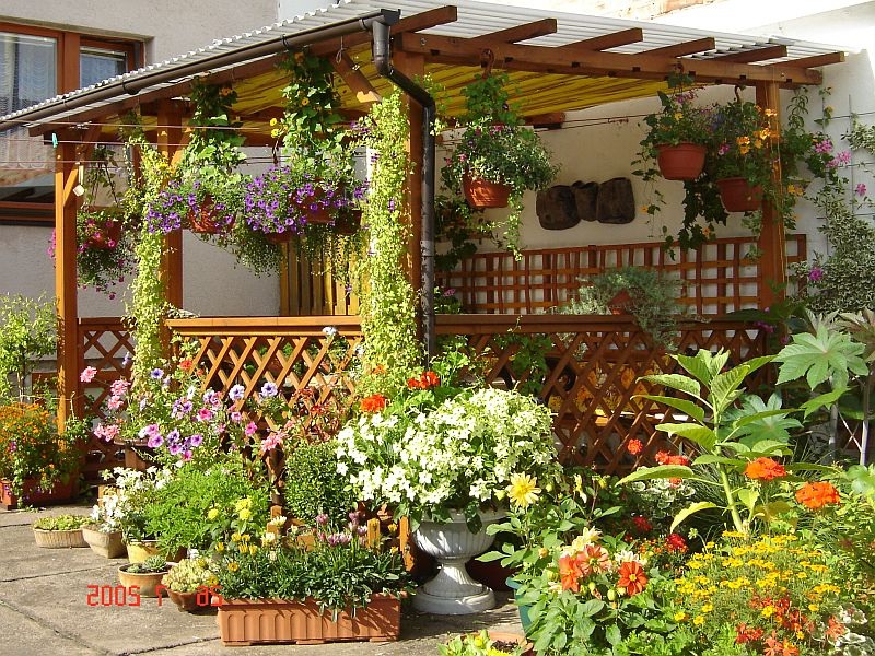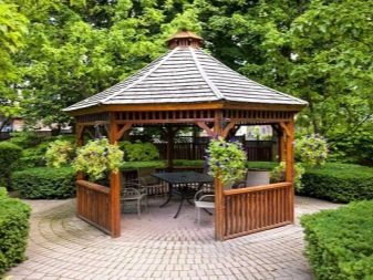 - Un belvédère confortable en bois de forme octogonale, décoré de fleurs tout autour du périmètre.