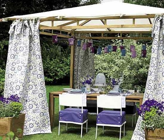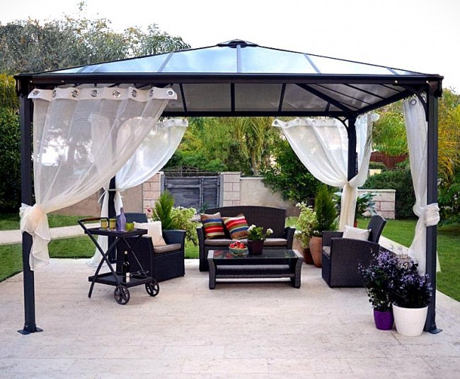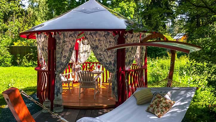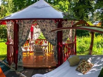 Si l'espace à l'intérieur est suffisant, la tonnelle peut être divisée en zones fonctionnelles différemment. Par exemple, vous pouvez y aménager une zone de loisirs, suspendre un hamac, installer des meubles rembourrés.