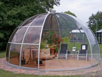 Le verre est utilisé pour les gazebos d'intérieur.. Il vous permet de vous débarrasser des insectes sans les priver de la lumière naturelle. Dans ce cas, le matériau contribue à la préservation de la chaleur et, avec le bon choix, il peut également devenir une partie transformable de la tonnelle.