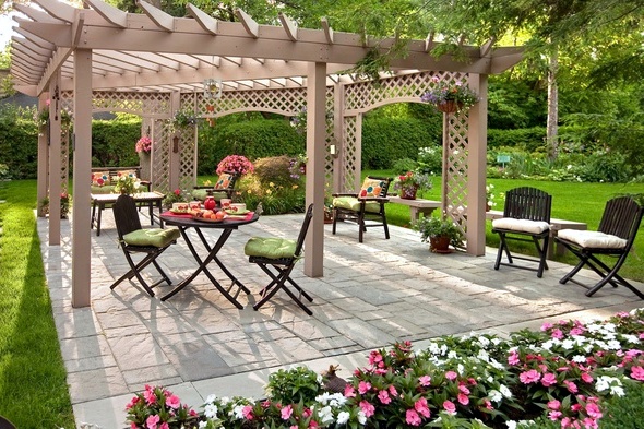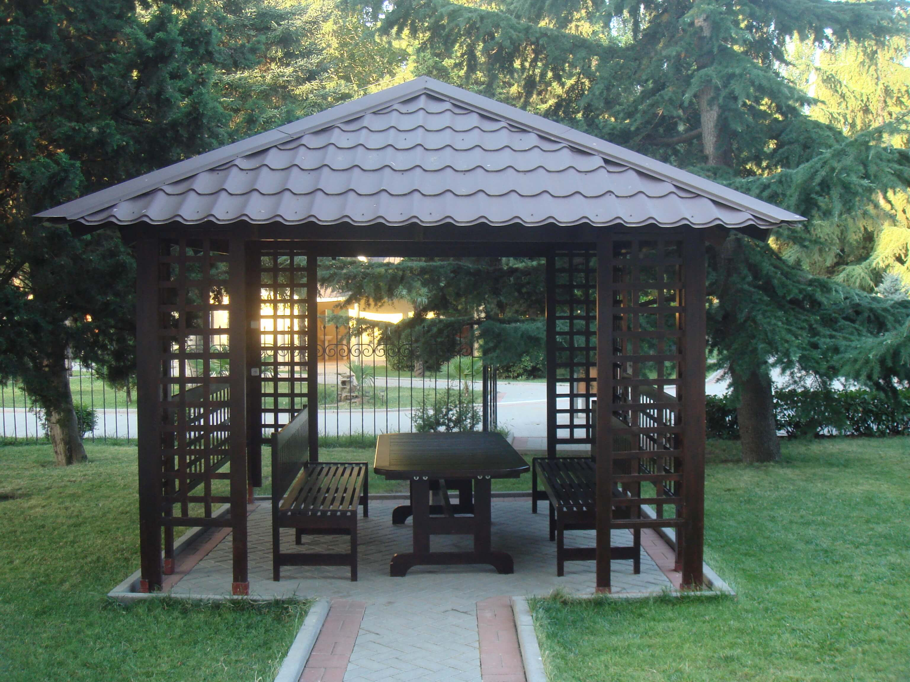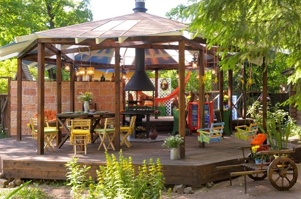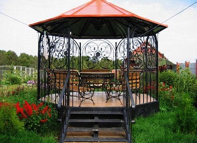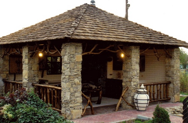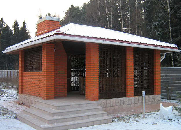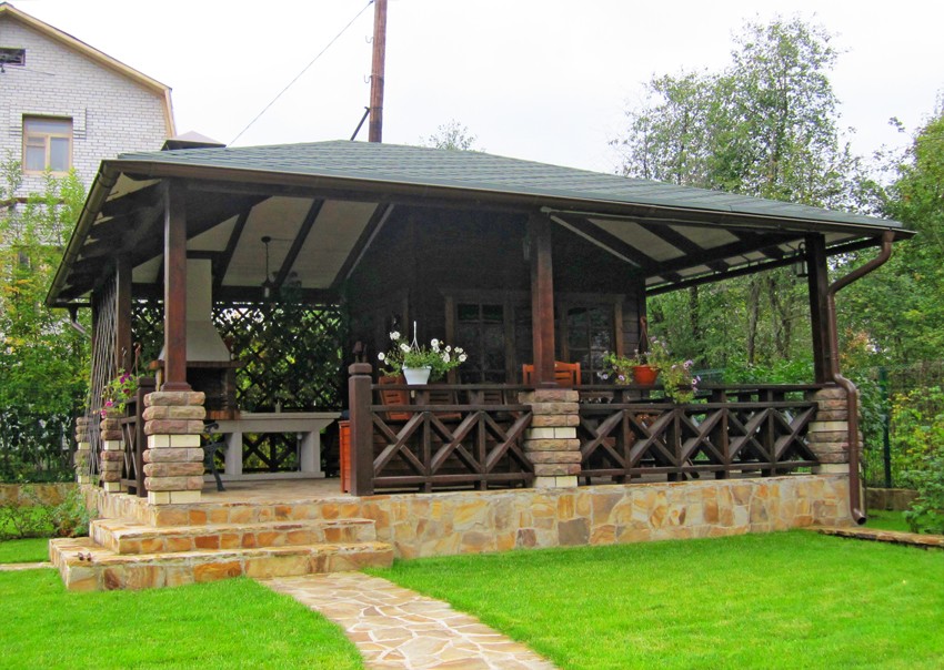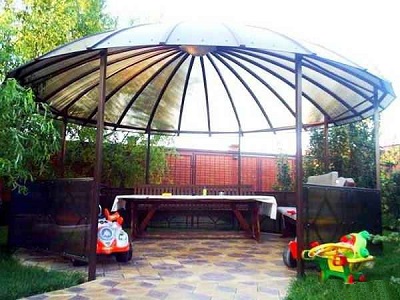 Par exemple Les kiosques ouverts sont considérés comme les modèles les plus simples. Ils n'ont pas de murs: ils sont remplacés par des supports. Souvent, ces structures n'ont pas de clôtures, ainsi que les fondations. Ces bâtiments peuvent remplir les fonctions d'un hangar ou d'un abri du soleil lorsque vous vous détendez au grand air. Ils sont destinés à être utilisés en été.. Souvent, ces installations sont fabriquées de leurs propres mains à partir des matières premières les plus diverses, ce qui permet d’ajouter une touche distinctive et une couleur spéciale au paysage.