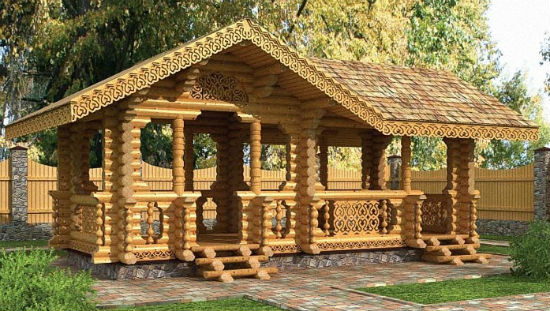 L'arbre est le matériau le plus populaire pour la construction de tonnelles. Il est chaud, naturel et sans danger, ne dégage pas de substances toxiques et convient à la construction de bâtiments de conception différente. Cependant, le principal inconvénient de ces arbres est le retrait constant, qui ne s’arrête pas après la phase active, qui dure environ six mois. Par conséquent, les matériaux de finition et de placage doivent être sélectionnés très soigneusement.