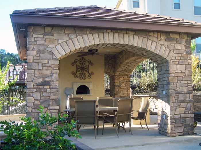 S'il y a plus d'espace et que la forme est rectangulaire, le brasier peut faire partie intégrante de tout le mur, fonctionnant avec un poêle, un chaudron, un tandoor, un bûcher et un évier. Dans ce cas, la table et les chaises peuvent être placées au centre du belvédère ou du côté opposé.