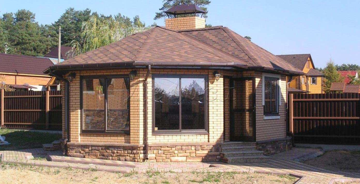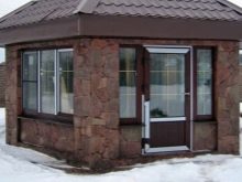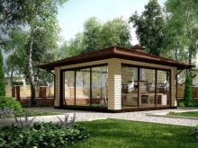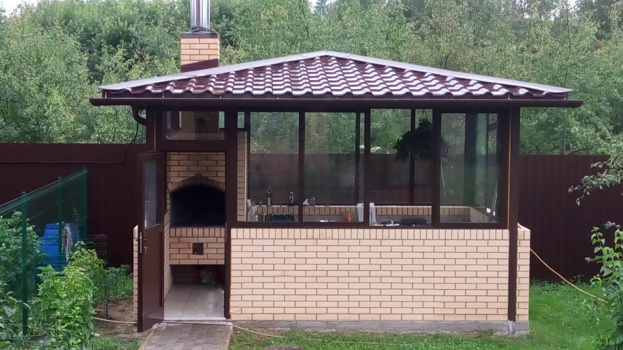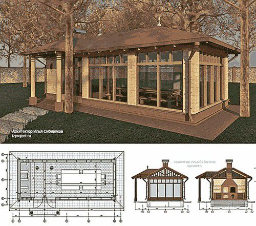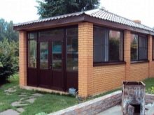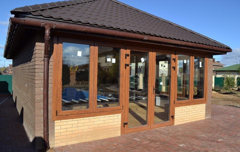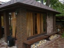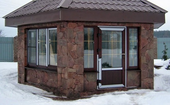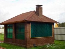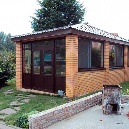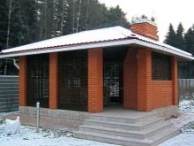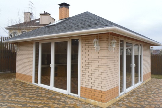 - Type fermé. En fait, la construction se présente sous la forme d'une petite maison en brique. Il peut être chauffé, dispose d'un système de ventilation. Ici, vous pouvez installer un double vitrage et une porte fiable. Lorsque le poêle ou le chauffage électrique dans une telle pièce, vous pouvez enlever les vêtements de dessus même en cas de gel sévère et passer du temps confortablement à une table dans une entreprise conviviale.