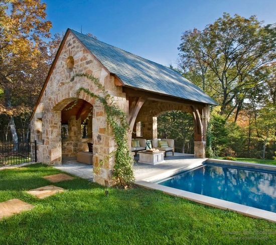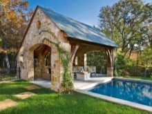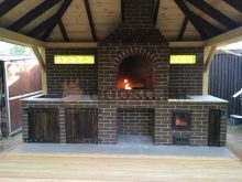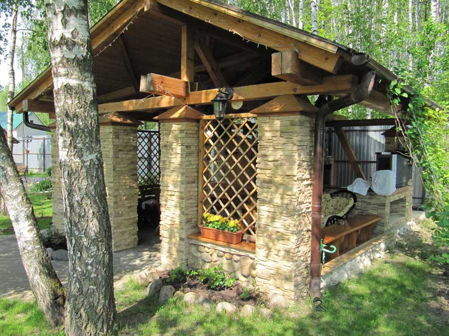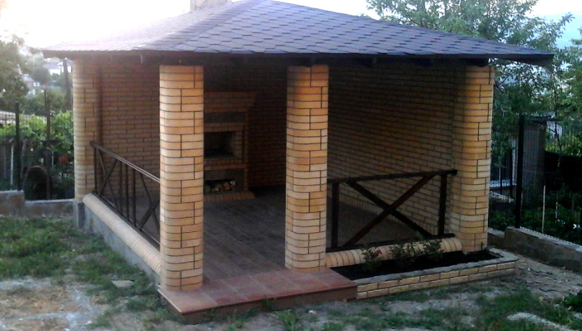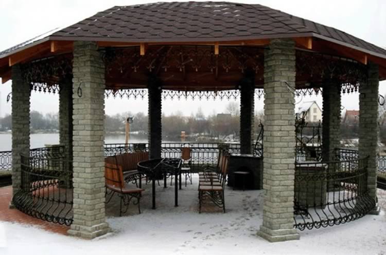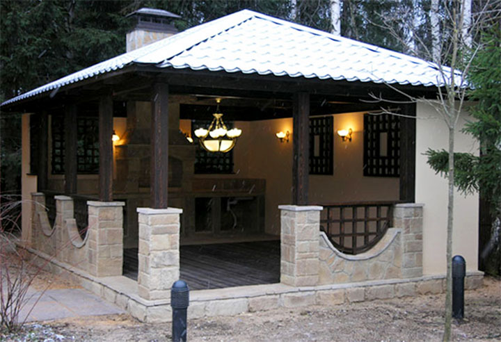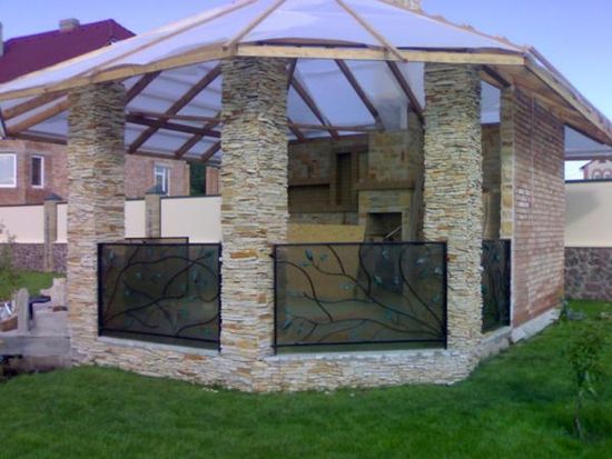 - Une tonnelle en brique semi-ouverte avec un poêle, des supports en métal soutenant le toit et une taille de pierre est perçue comme une structure fiable, solide et confortable. Sous son toit, vous aurez envie de passer du temps en compagnie amicale jusqu'à la fin de l'automne.