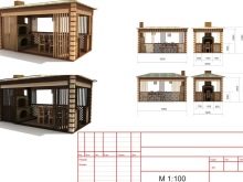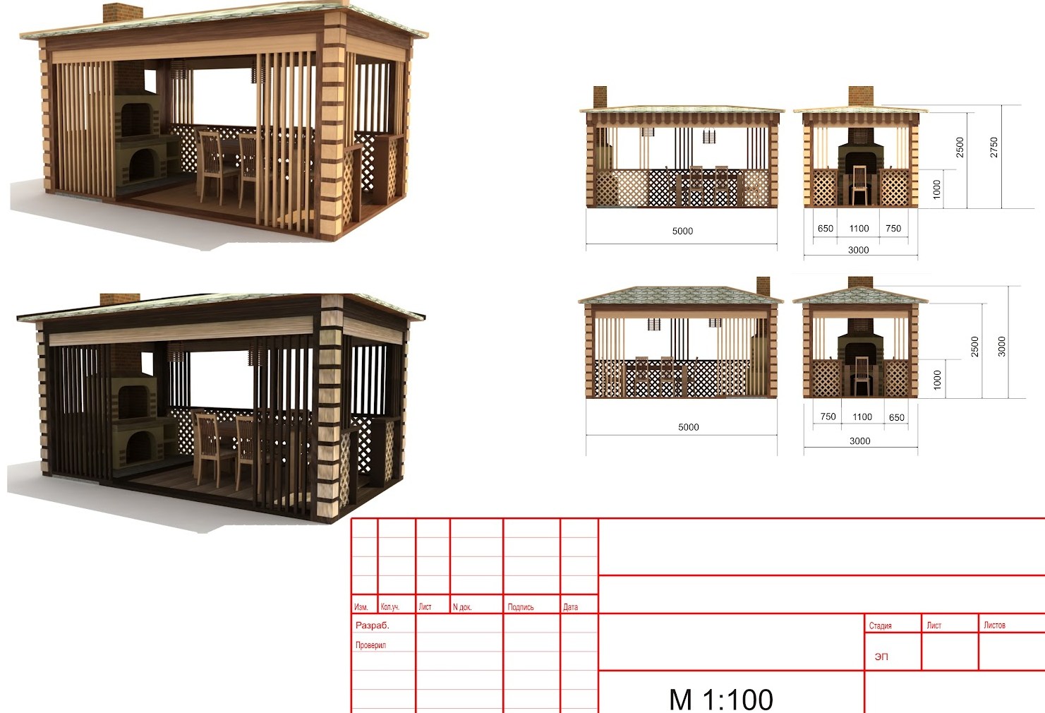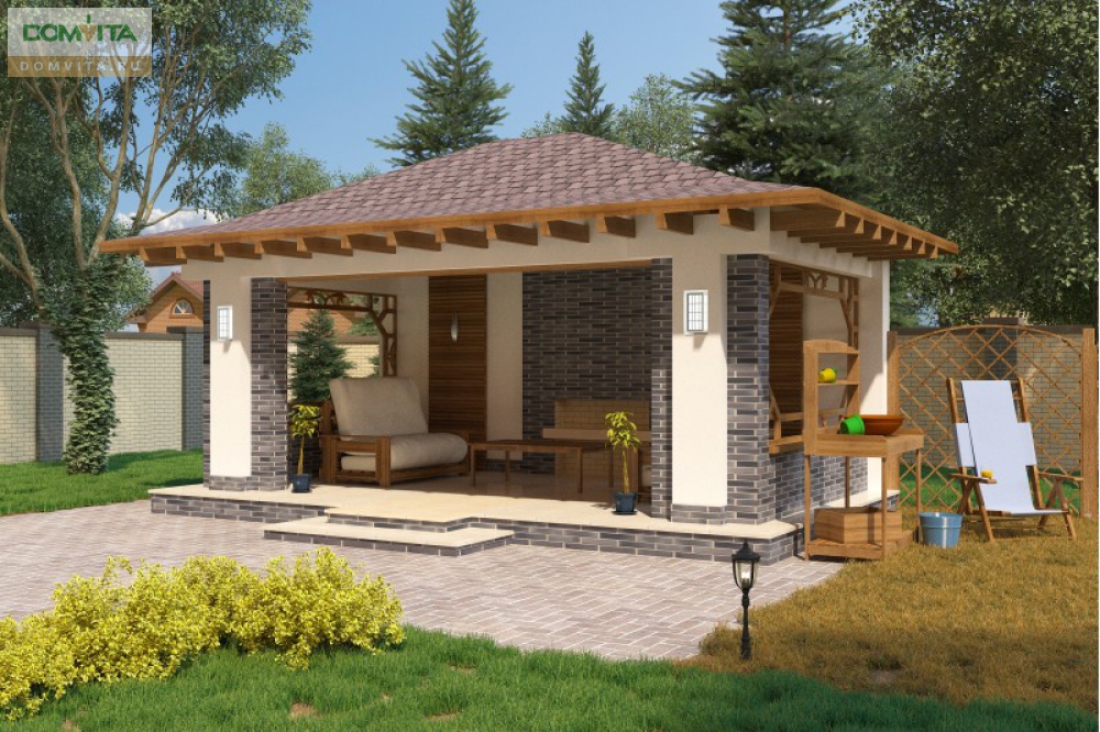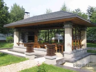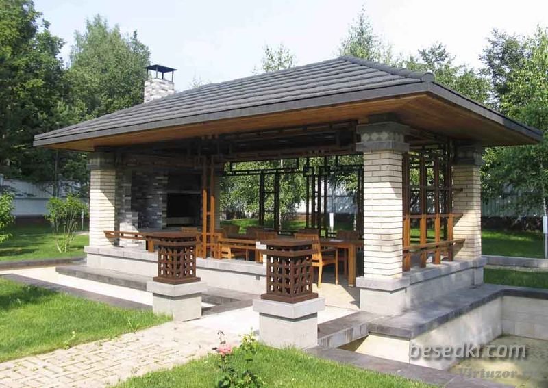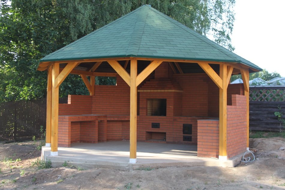 - Type ouvert. Dans ces bâtiments, il n'y a pas de portes, de murs et de fenêtres. La structure se compose de rayonnages et d'un toit supporté par eux. En dessous, vous pouvez installer un barbecue ou un gril.