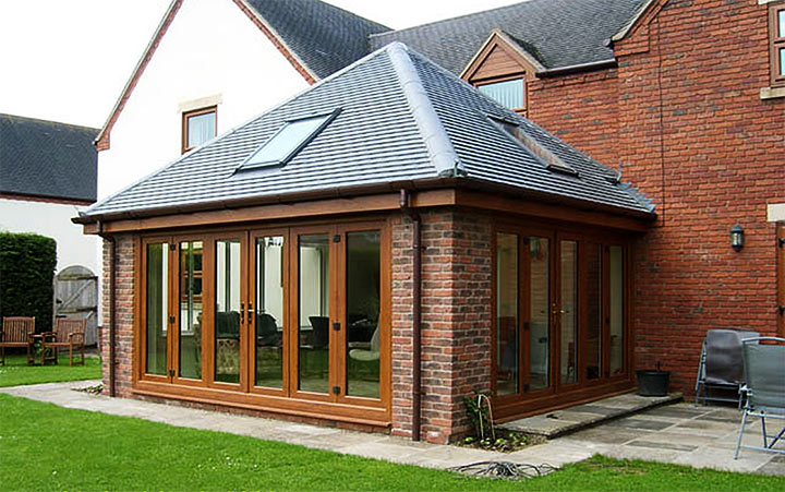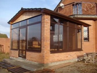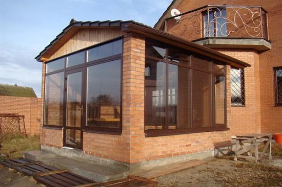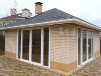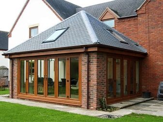 - Le pavillon vitré attenant peut ressembler à une continuation de la maison en raison du toit à quatre côtés reprenant les contours du toit principal. Les vitrages et puits de lumière à grande échelle vous permettent de remplir l'espace intérieur de lumière et de chaleur. Il sera confortable ici par temps humide et froid.