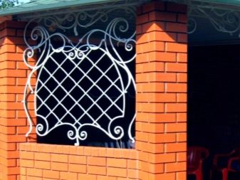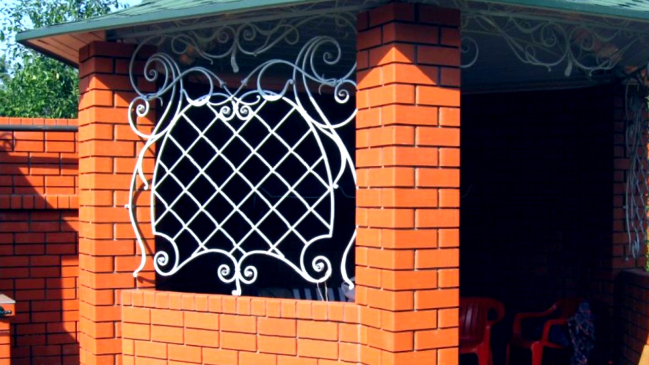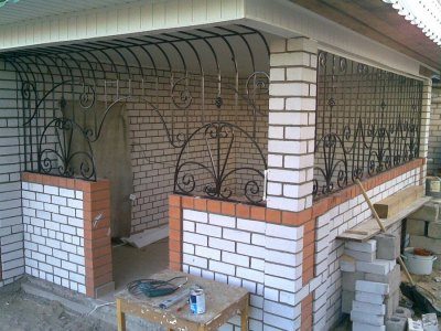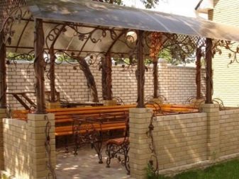 Une forge ajourée peut être émise même du mur de la structure de haut en bas. Cela paraîtra cher et facile en même temps si vous choisissez un dessin avec de grands écarts entre les éléments artistiques. Il est également nécessaire de créer un décor à l’intérieur de la tonnelle avec des éléments forgés, par exemple dans la conception de la table, des canapés et des chaises.