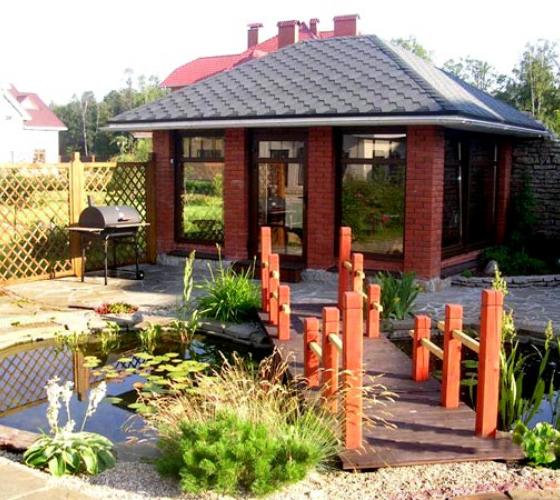 Une pelouse impeccable, une passerelle en pierre menant au belvédère, une vue panoramique sur une lanterne pour l'éclairage du soir, des textiles et rideaux appropriés, des ustensiles en terre cuite et en cuivre créeront une atmosphère agréable et un sentiment de confort dans un belvédère en brique.