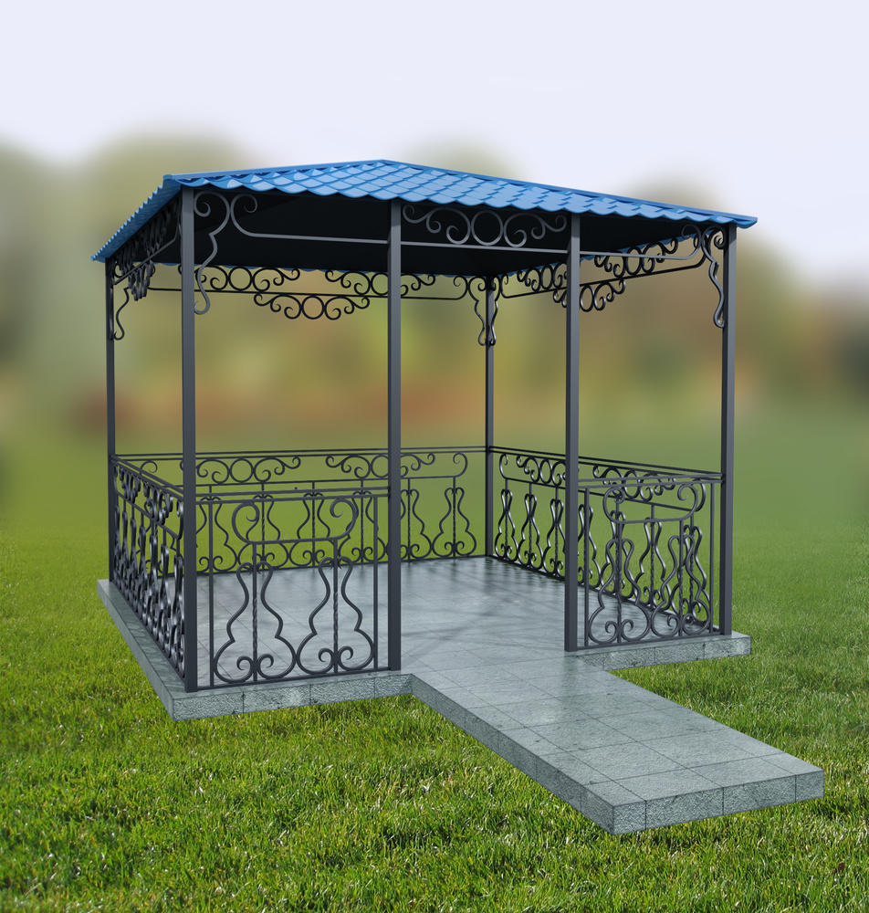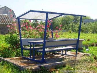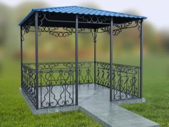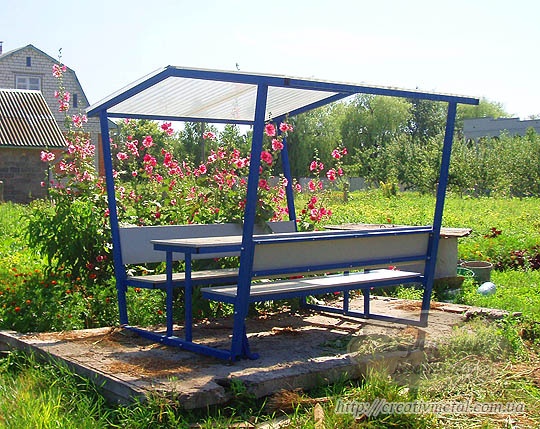 Ceci est une version d'un gazebo qui peut être créé à partir de presque rien. Littéralement à partir des restes de tôles, tiges, profils, coins, etc. Très pratique pour la conception d’artisans connaissant l’art de travailler sur une machine à souder. Les éléments forgés apportent le raffinement le plus simple au design et une attractivité supplémentaire. Ce n’est pas une option économique, mais c’est peut-être un ajout simple mais pratique à votre chalet d’été.