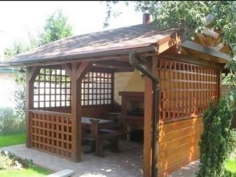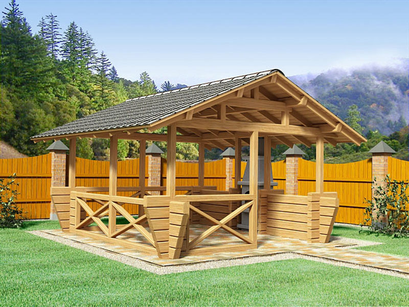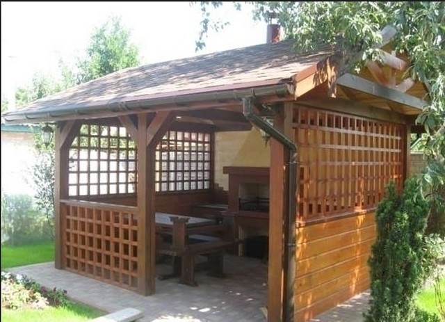 Durable, beau, respectueux de l'environnement. Cette option est difficilement économique. Mais les amateurs de bois et d'air pur apprécieront ce design. Un minimum de matériaux sera nécessaire pour construire les gazebos les plus simples avec leurs propres mains, notamment des barres en bois et des panneaux tranchants. Mais vous pouvez également utiliser le rail pour fabriquer des caisses en osier. Pour le toit d’une telle tonnelle, les professionnels recommandent les types de toiture en ardoise, en métal, en polycarbonate ou flexible.