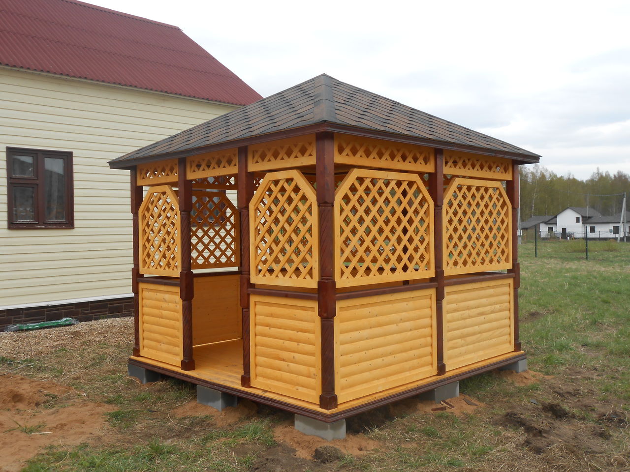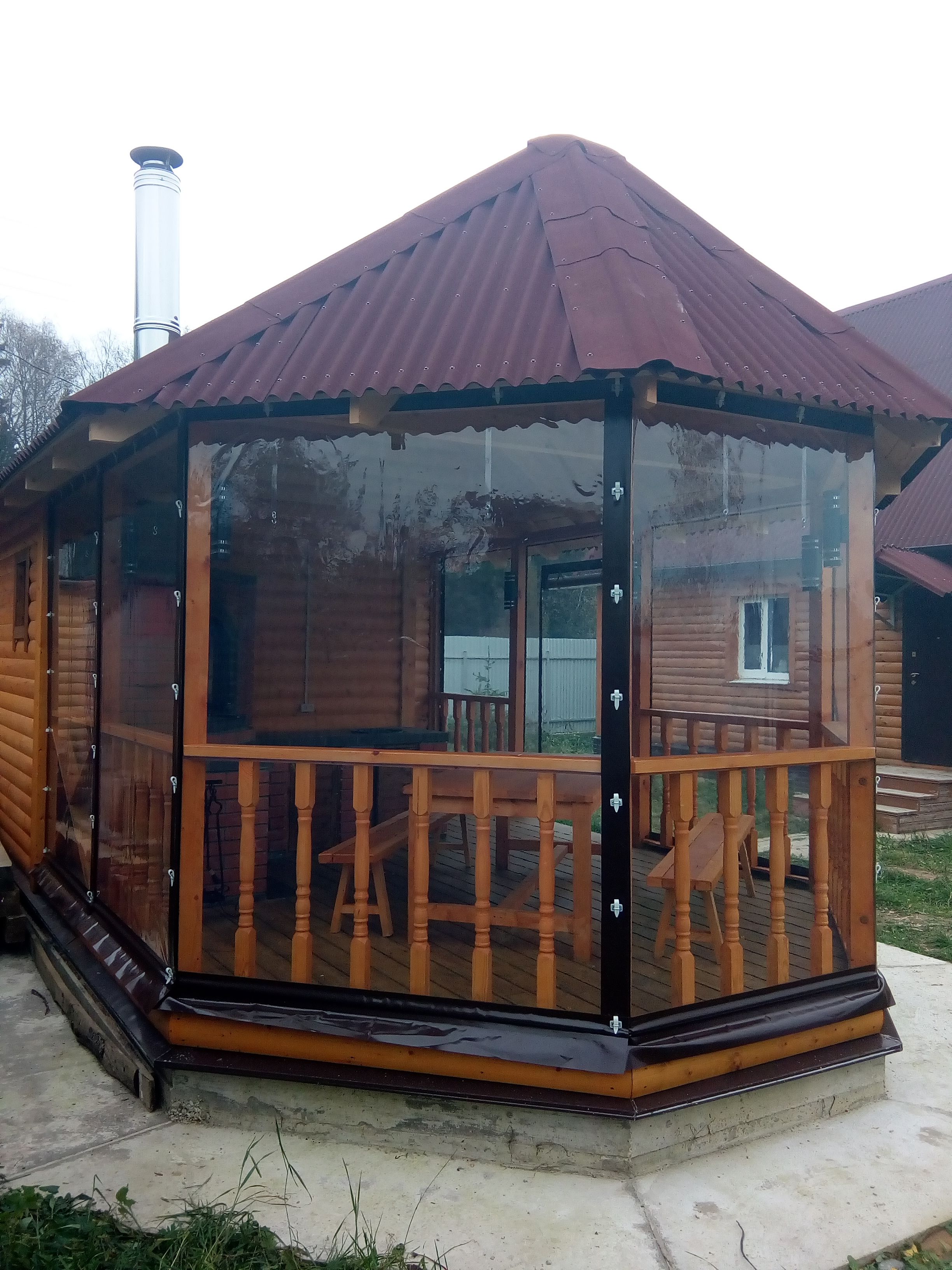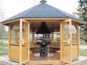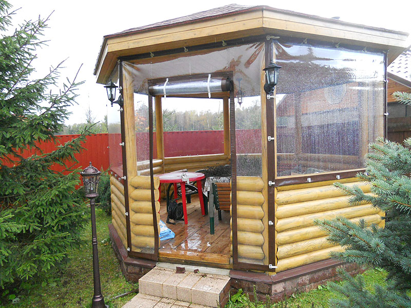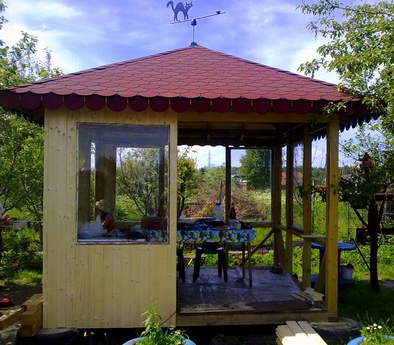 C'est une construction plus solide, mais pas particulièrement difficile pour l'auto-érection.La principale commodité d'un tel bâtiment est sa capacité à le réchauffer et à en faire un lieu de repos toutes saisons. Cependant, la décision en faveur de son utilisation permanente ou temporaire devrait être prise au stade de la conception afin d'inclure les fenêtres, les portes et autres nuances supplémentaires dans le plan-schéma. Et n'oubliez pas qu'un gazebo aussi solide doit nécessairement avoir une base solide.