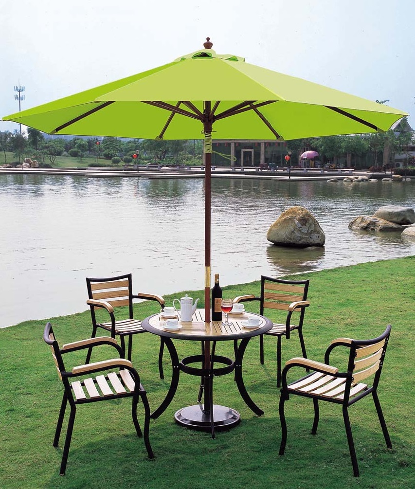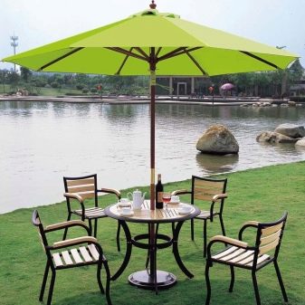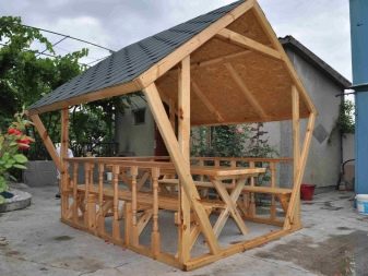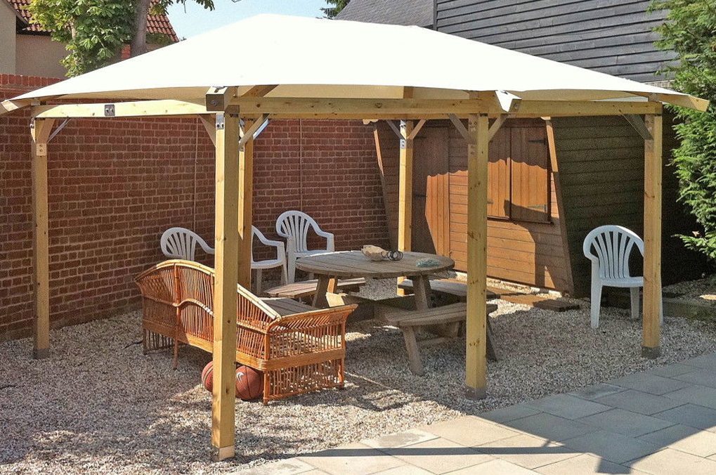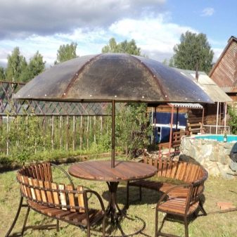 Seul l'arbre suspendu au-dessus de la salle à manger peut être plus simple que cette construction. La base de la tonnelle est un tronc lourd et durable, qui sert de support supplémentaire à un auvent. La base du tuyau central est bétonnée et enfouie dans le sol. Comme le toit peut être n'importe quel matériau du tissu imperméable à l'eau avec une imprégnation spéciale pour le film de PVC omniprésent. Les contrefiches doivent être de poids léger, de sorte que les lattes de bois ou de profil sont généralement utilisées.