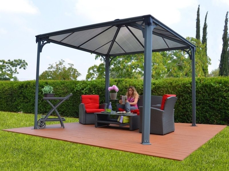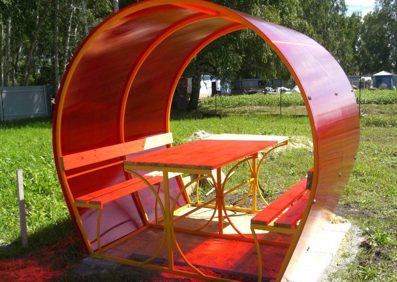 Le matériau le plus polyvalent de tous. Comparé aux deux précédents, il peut dépasser légèrement le coût, mais la fonctionnalité d'une telle tonnelle ne vous décevra pas.