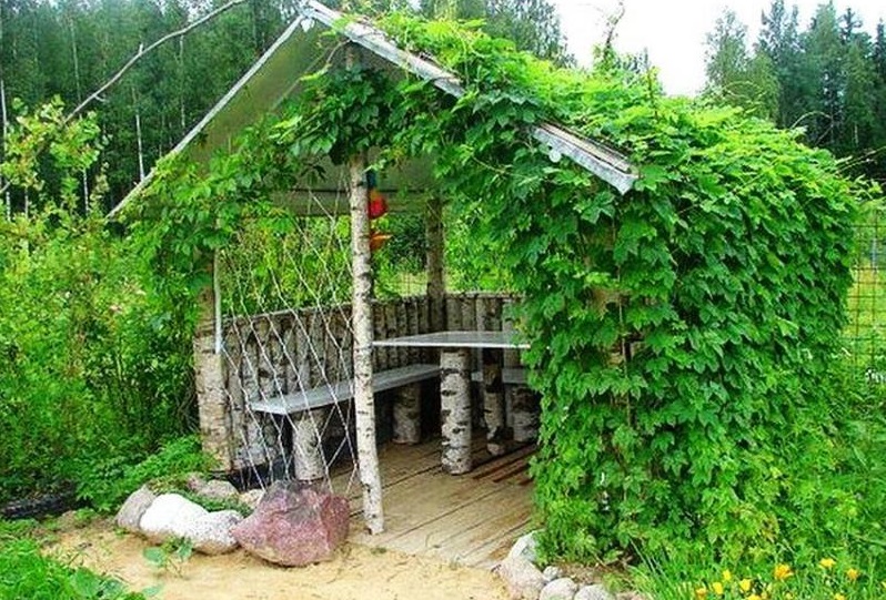 Les propriétaires expérimentés peuvent créer une tonnelle avec les outils disponibles. Le toit «vivant» a une apparence naturelle d'origine: fleurs frisées, raisins sauvages ou fruitiers.