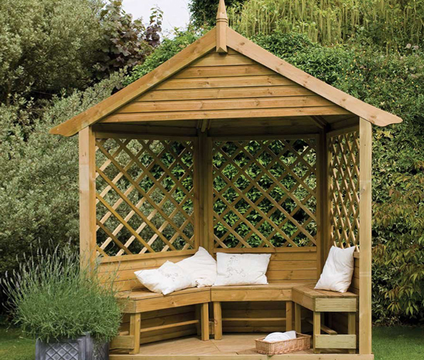 Les kiosques de jardin d’été les plus simples ressemblent en général à une tente ou à un auvent tendus entre des colonnes en bois ou en métal.