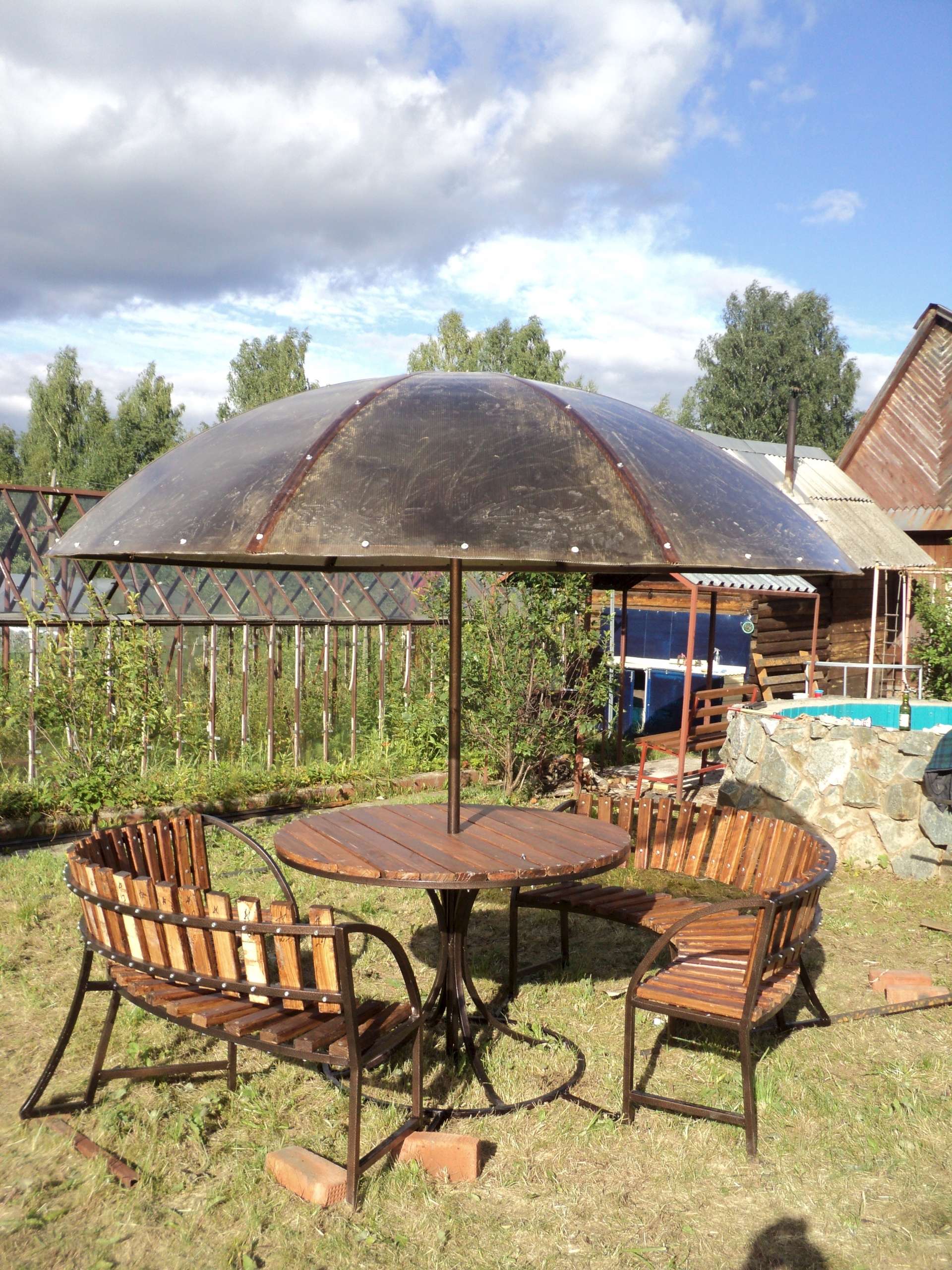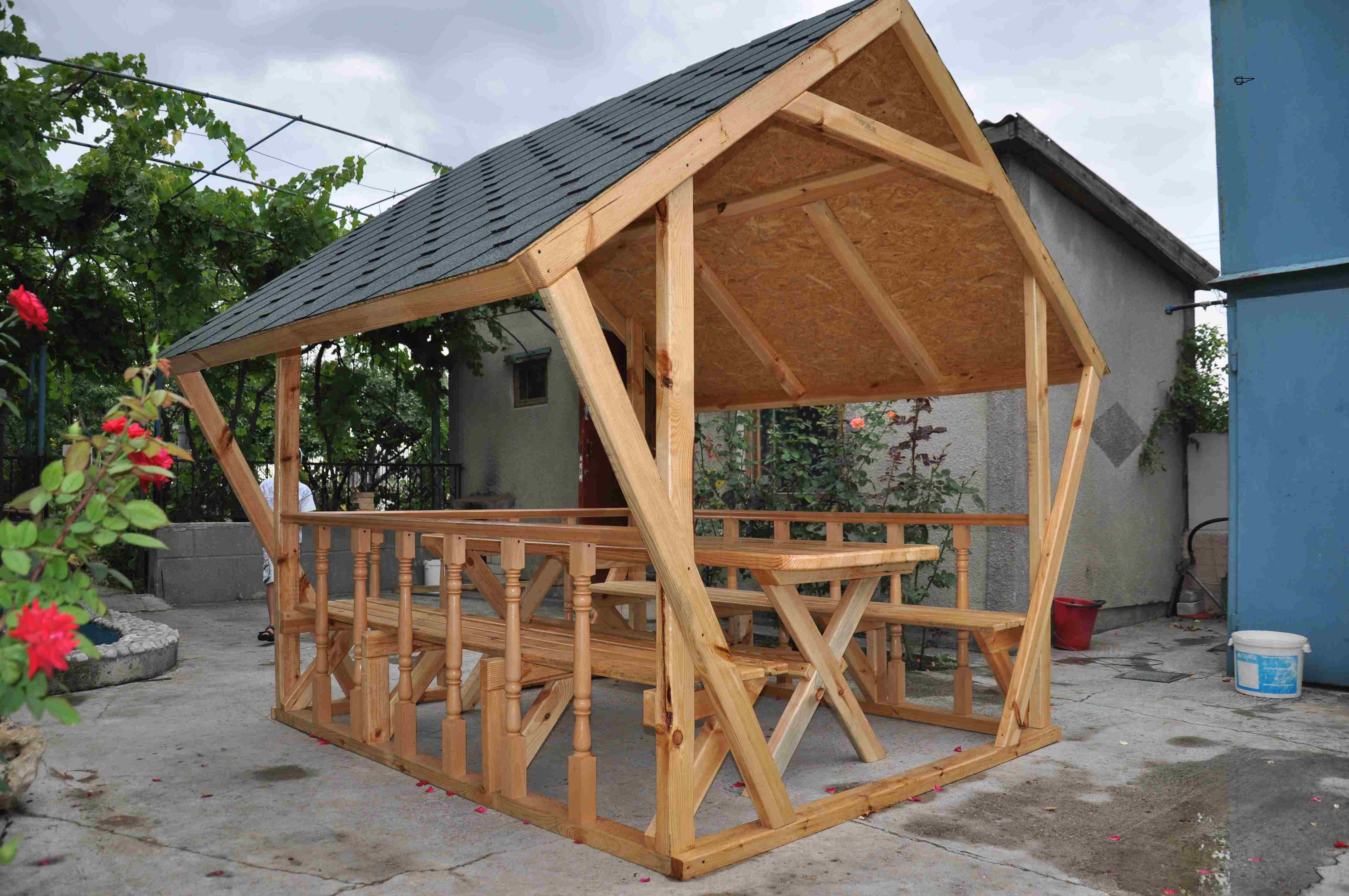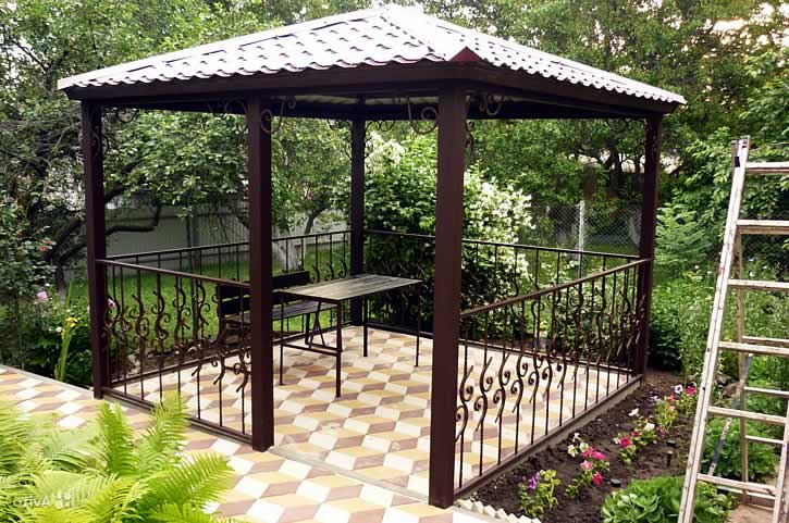 Gazebo simple mais fonctionnel pour le jardin. Si vous le souhaitez, vous pouvez étirer les fenêtres souples - film PVC pour protéger les vacanciers du vent ou de la pluie.