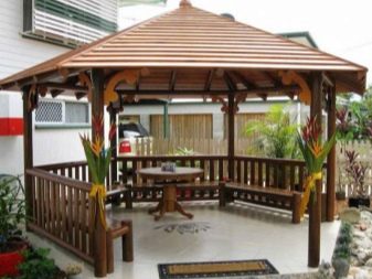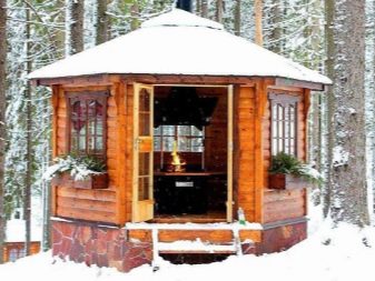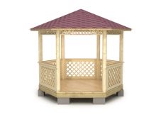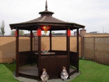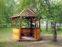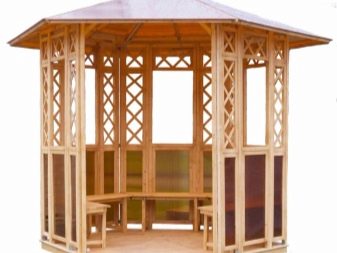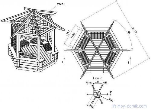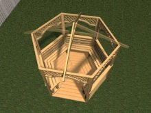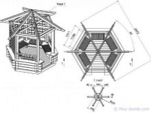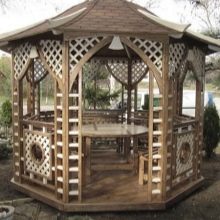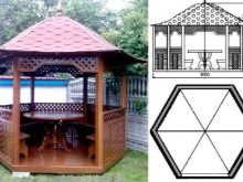 Il est possible d'utiliser des maisons en rondins prêtes à l'emploi acquises auprès de spécialistes. Dans ce cas, il suffit d’arranger correctement les pièces et de poser le toit.Ainsi, la pergola hexagonale est montée tout simplement.