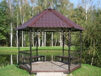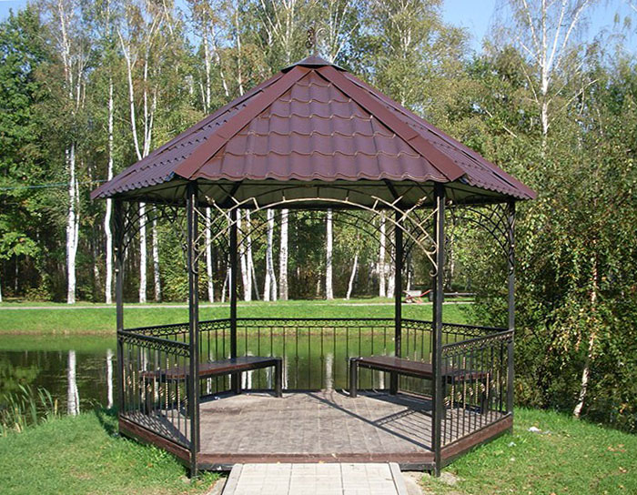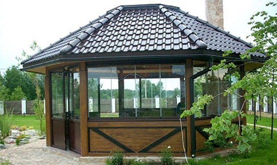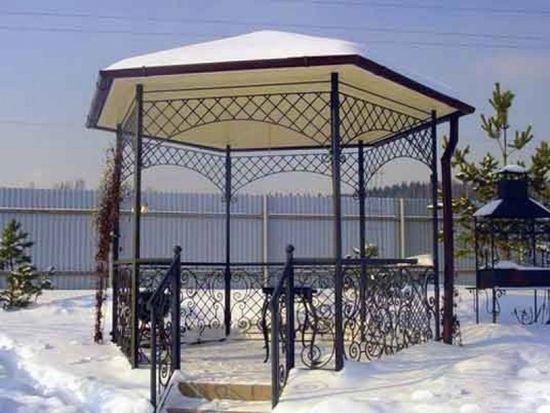 - Les matériaux du profilé métallique - avec tous les aspects positifs, présentent des inconvénients opérationnels. Exige une peinture régulière. En cas de pluie, ils émettent beaucoup de bruit - cela ne fonctionnera pas dans une telle tonnelle. Posséder un attrait esthétique insuffisant.