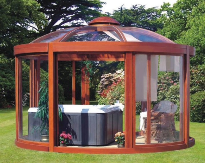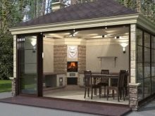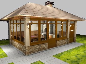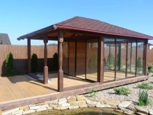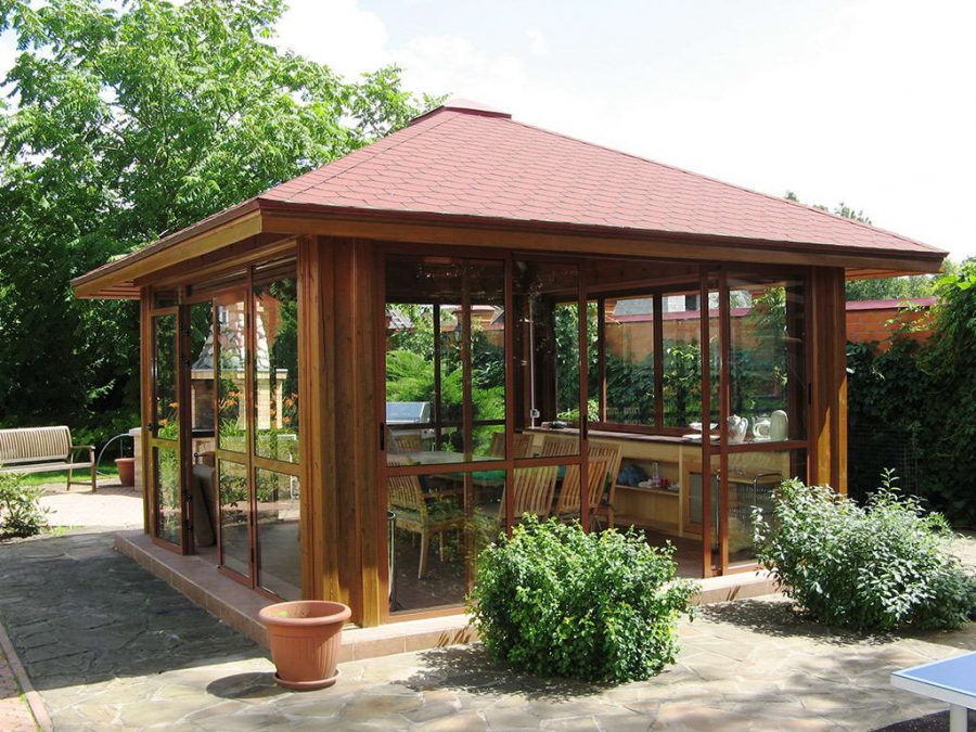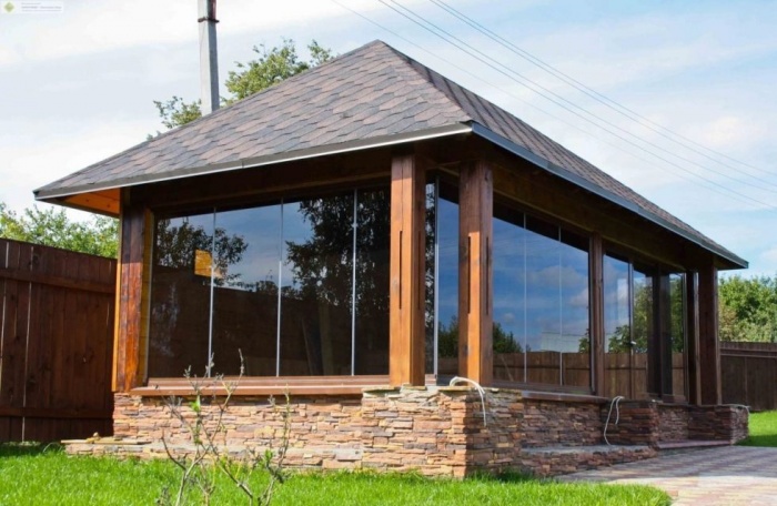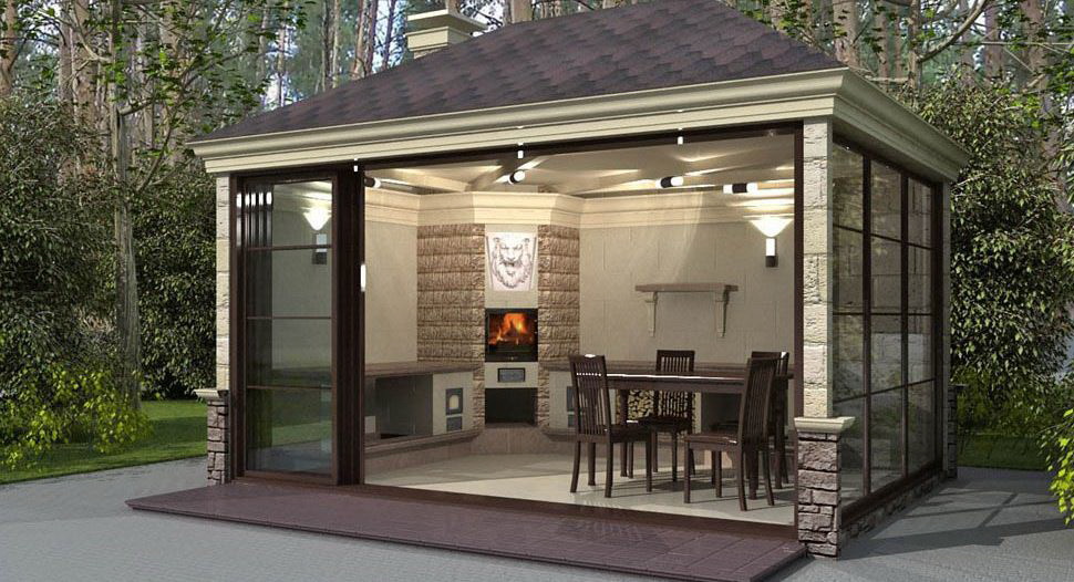 Par exemple, s'il est conçu comme un coin isolé de la parcelle de jardin d'une maison d'été, il est isolé des regards indiscrets, ce qui réduit la taille du verre.Une telle tonnelle ressemble à une petite maison d'hôtes. En même temps, il peut y avoir une cheminée, un ensemble de meubles rembourrés et même une télévision.