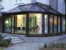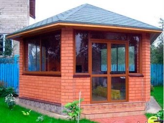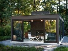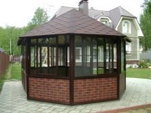 Le caractère raisonnable des caractéristiques du paysage permettra d’y entrer correctement, même dans une version laconique d’un gazebo vitré. Cependant il est souhaitable que le matériau de sa construction coïncide avec celui à partir duquel la maison est faite. De plus, il est important de prendre en compte que l'harmonie ne permet pas de prendre différentes décisions stylistiques.