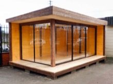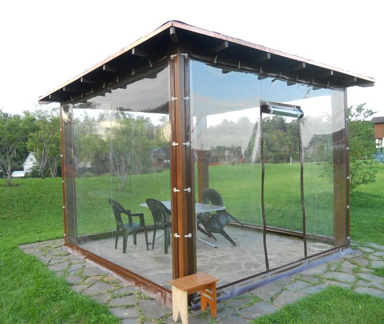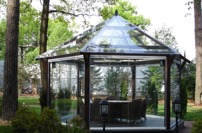 - Un exemple de gazebo avec vitrage de façade. Le toit et les murs transparents rendent la structure visuellement légère.