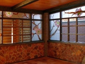 Selon le style choisi, ils peuvent être décorés non seulement avec des rideaux, mais également avec des étagères avec des fleurs fraîches. Le vitrage de telles constructions est plus facile, car ici les fenêtres sont utilisées plus souvent.