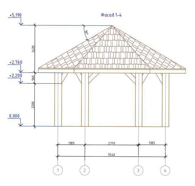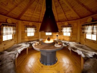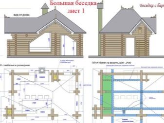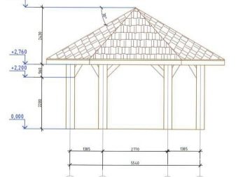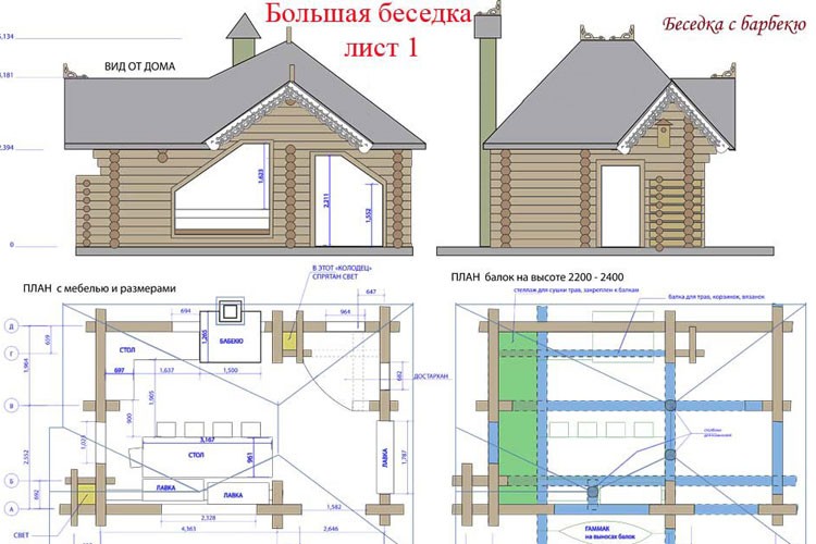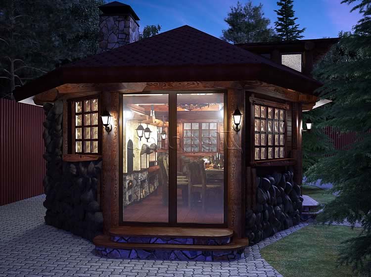 La meilleure taille de ce type de gazebos est la version à bûche de 4x4 m avec des fenêtres classiques, tapissée de murs, de plancher et de cheminée.Avec la bonne approche de la construction, une option avec les mêmes dimensions peut également être faite de pierre et de brique.
