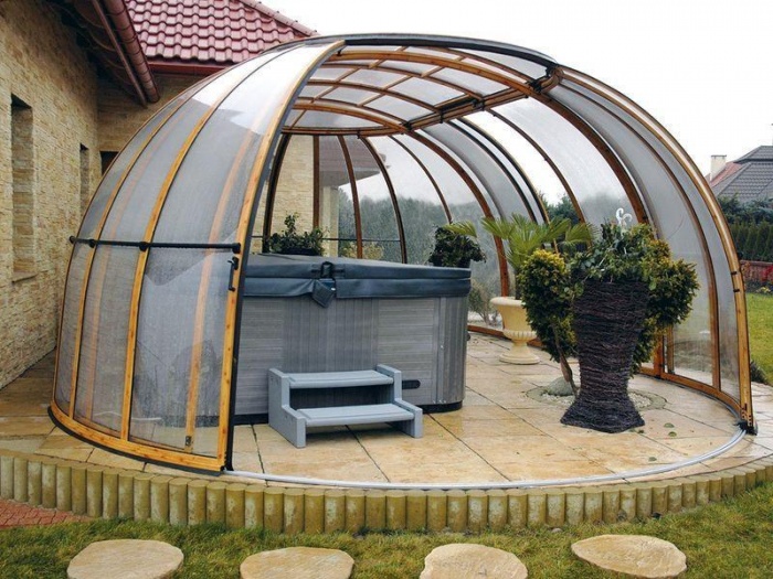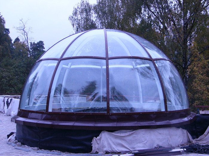 En raison de la forme, le principe de la disposition des meubles change également, ce qui permet de placer une tonnelle à l’intérieur, ce qui est inhabituel. Les options hémisphériques, en termes de vitrage, sont plus complexes à exécuter, mais elles semblent inhabituelles.Pour réaliser une telle structure sous la force d'artisans expérimentés, en utilisant du polycarbonate flexible et un cadre en métal.