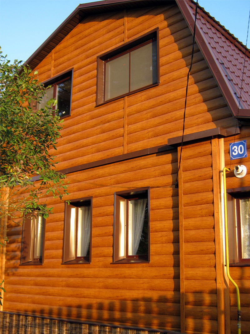 Les panneaux de vinyle destinés à être coupés sous une bûche en un seul lot ont le même ton, contrairement au bois.Ils sont également bien combinés avec des éléments décoratifs sous la pierre, avec des tuiles et des briques. Les panneaux sont équipés d'aérations permettant d'éviter la formation de condensation entre la peau et les murs de la maison. Dans le même temps, le blockhaus conserve parfaitement la chaleur. Et si nécessaire, il vous permet de placer une isolation thermique et acoustique supplémentaire entre le mur et les panneaux de revêtement.