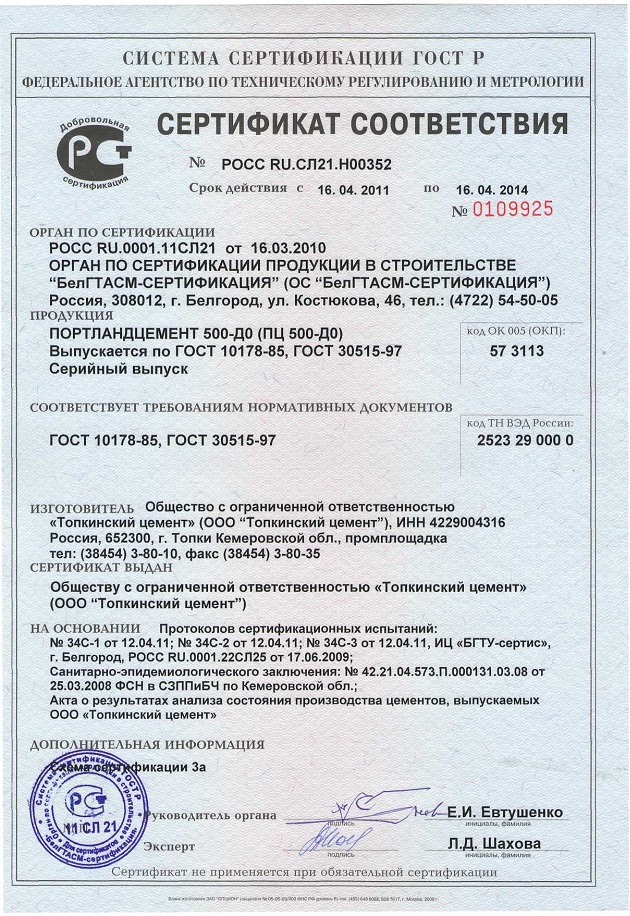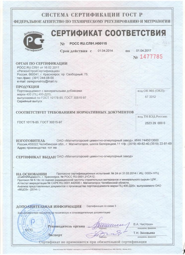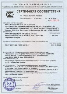 La composition et le pourcentage des composants du mélange sont régis par le document GOST 10178 85 "Ciment Portland et Ciment Portland de laitier". Le respect des exigences de la production garantit de hautes caractéristiques techniques et opérationnelles du produit.