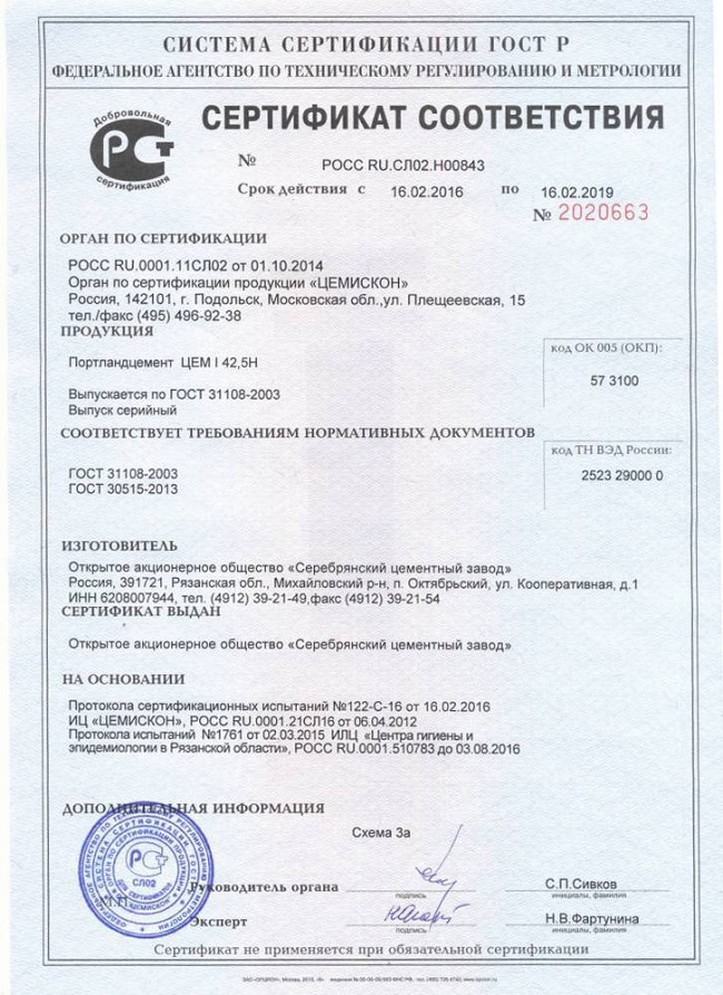 Tous les types de ciment sont divisés en non additifs et additifs. Composition de Bezobavochny ne contient pas d'additifs minéraux autres que le gypse. Il convient aux objets de nature monolithique en surface, souterrains et sous-marins, ainsi qu'aux structures en béton préfabriqué et en béton arméqui sont exploités en l'absence d'un environnement agressif.