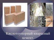 - Ciment résistant aux acides utilise dans la fabrication de sable de quartz et de fluorure de sodium, cette composition est résistante à la plupart des acides minéraux et organiques, elle ne change pas ses caractéristiques dans l'eau. Cependant, la réaction avec les alcalis commence à se décomposer.