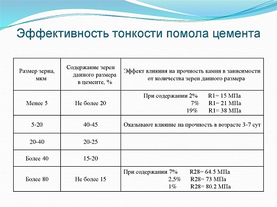 Ce paramètre détermine le taux de durcissement du mortier de ciment et la résistance de la pierre résultante. La dépendance est ici inverse - le moins de broyage - plus le processus de gel est rapide et plus le monolithe résultant est résistant. En conséquence, les prix du ciment à grain fin sont plus élevés.