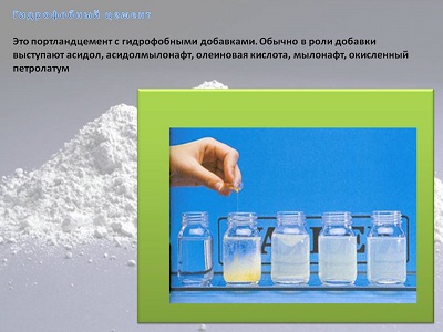 - Ciment hydrophobe - fabriqué en co-broyant du clinker de ciment Portland et du gypse, ainsi que par l'introduction de l'aisselle ou d'autres additifs hydrophobes.L'absorption d'eau d'un tel ciment est faible, car il peut être stocké longtemps, même dans des conditions d'humidité élevée, ce qui n'empire pas ses caractéristiques physiques et techniques. Ce mélange ne forme pas de grumeaux, et le béton sur sa base ne se fissure pas avec le temps et ne se stratifie pas.