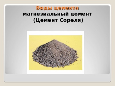 - Ciment de magnésie - obtenu à partir de matières premières riches en oxyde de magnésium. Il trouva son application dans la disposition des sols magnésiens.