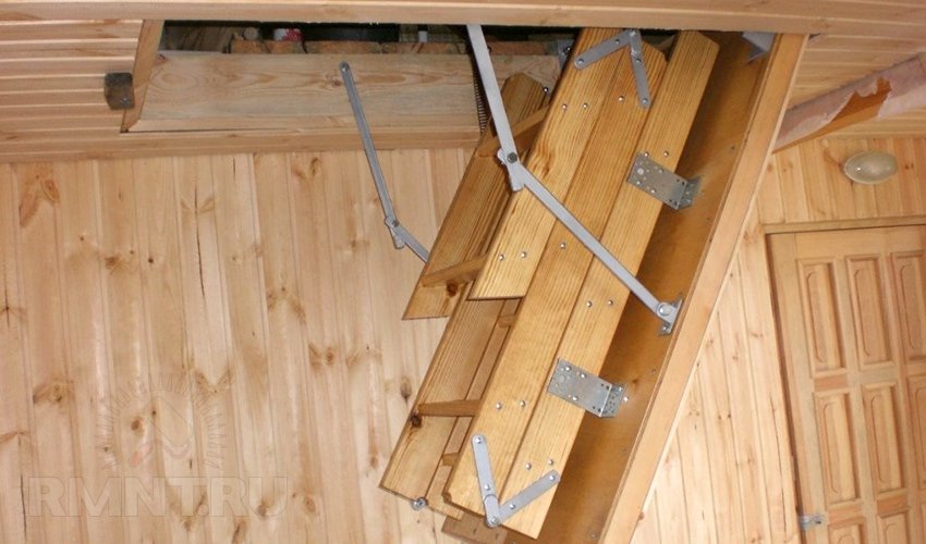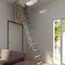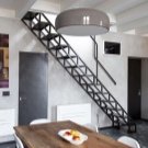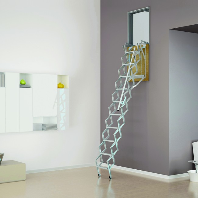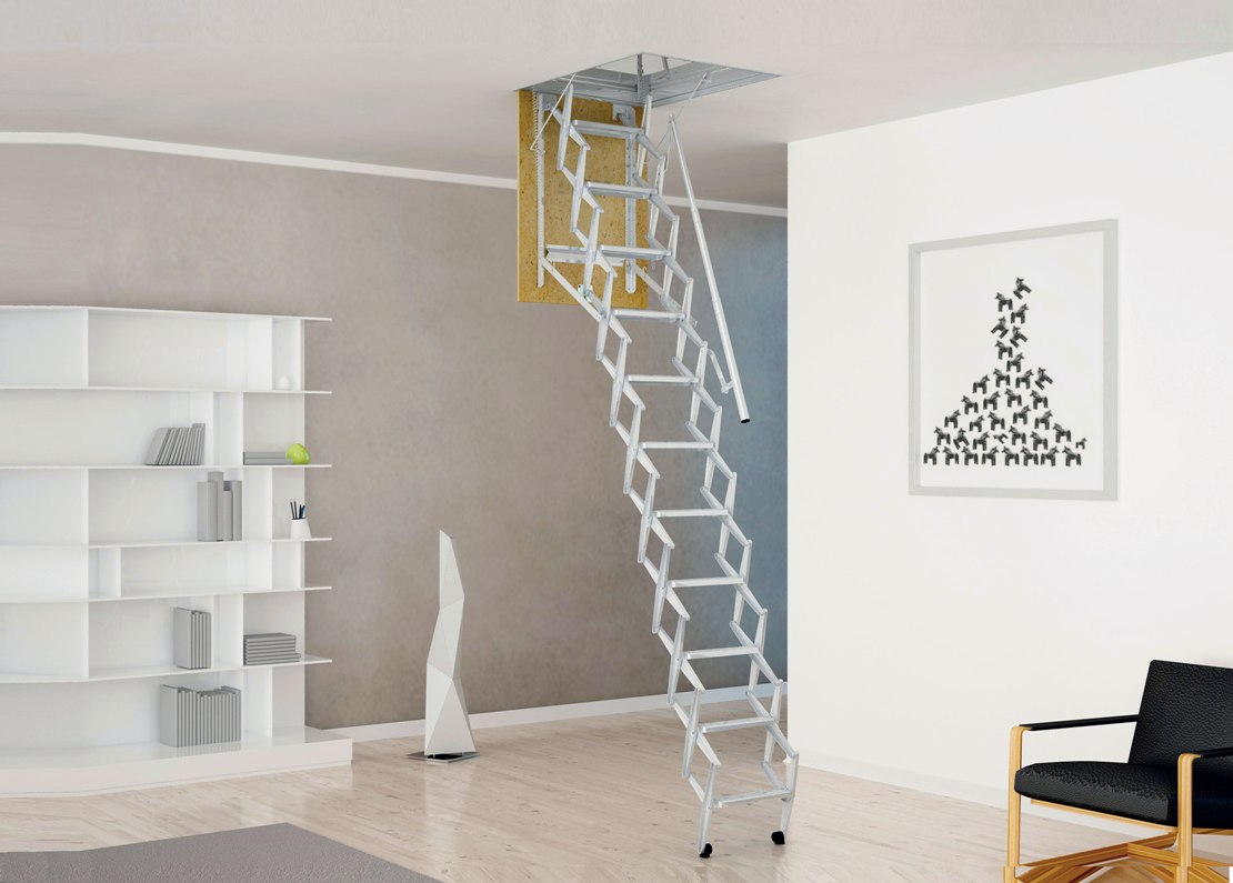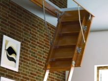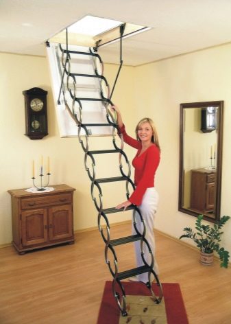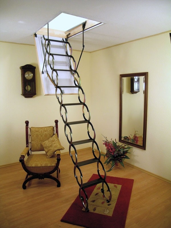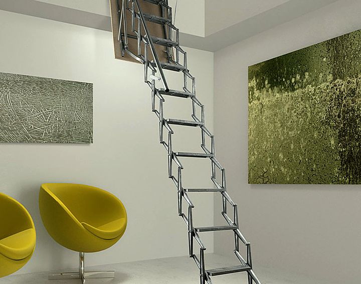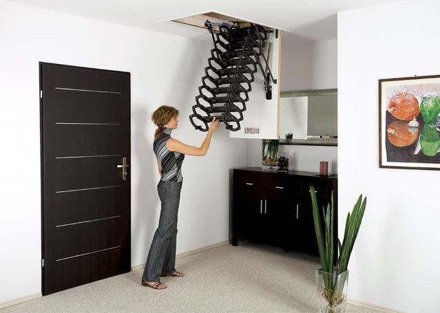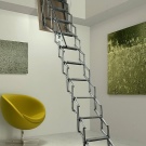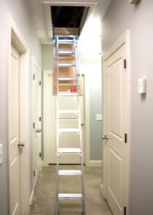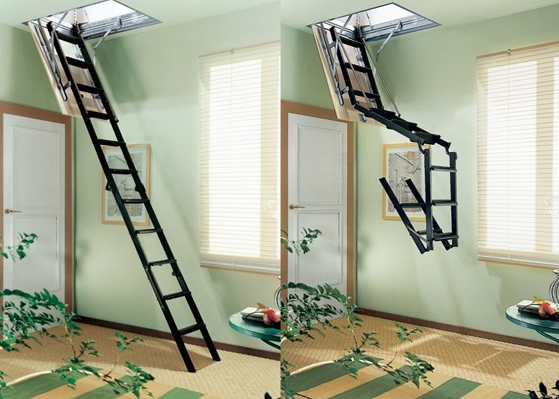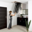 Vous pouvez également identifier les types de méthodes d'installation des escaliers. Fondamentalement, utilisé méthode de pliage, de glissement et télescopique. Ce dernier suggère le principe de son pliage, ce qui revient au fait que les sections de l'escalier se succèdent alternativement.Les parties inférieures sont plus épaisses que les parties supérieures, de sorte que les composants peuvent facilement s'intégrer. Un tel appareil plié a la plus petite taille, de sorte qu'il ne nécessite pas beaucoup d'espace de stockage.
