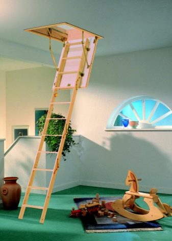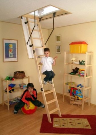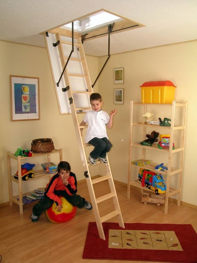 - Pour les maisons où vivent des enfants et où le grenier n'est pas utilisé quotidiennement, il est préférable de privilégier les options de conception coulissantes, dans lesquelles l'escalier lui-même est caché dans le trou d'homme. Il est utile d’équiper la serrure d’escalier. Cette option éliminera le risque que l’enfant tente indépendamment de grimper sur l’échelle et compromet sa santé et sa vie.