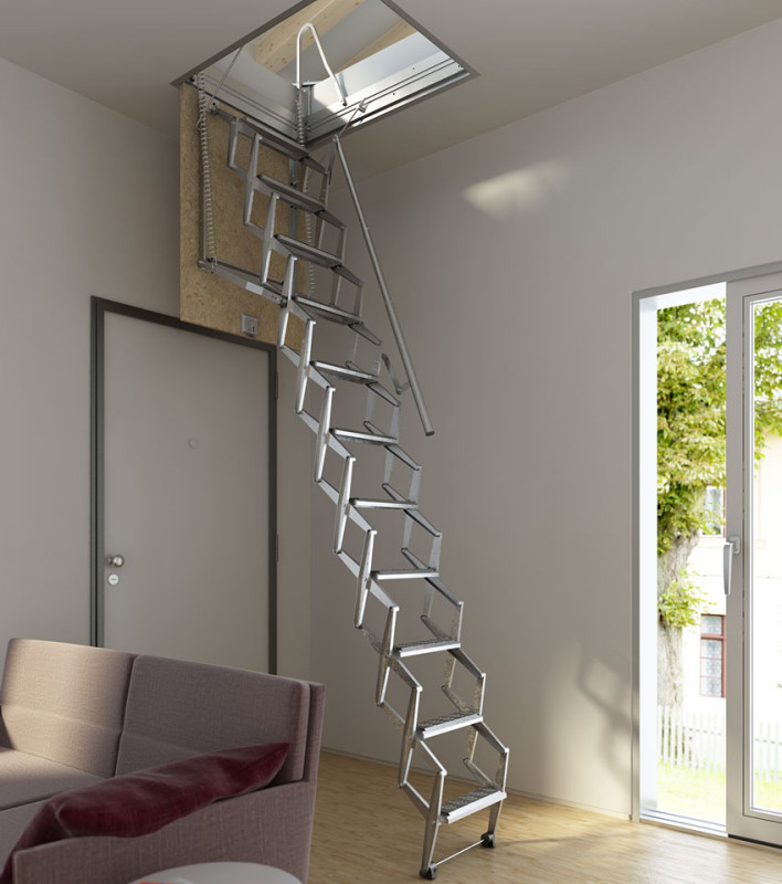 La plupart des fabricants utilisent le métal comme principale matière première pour les escaliers de grenier. Ceci s’applique aux produits télescopiques, coulissants et similaires, principe de pliage qui consiste à stocker des sections les unes par rapport aux autres.