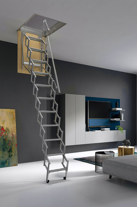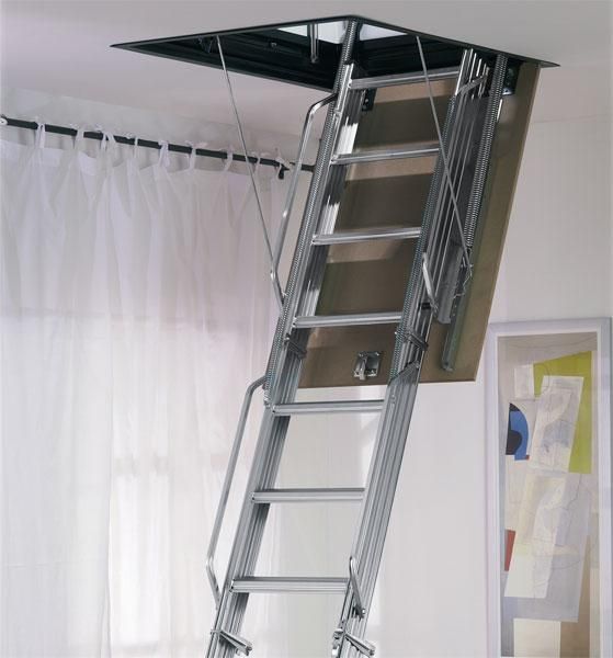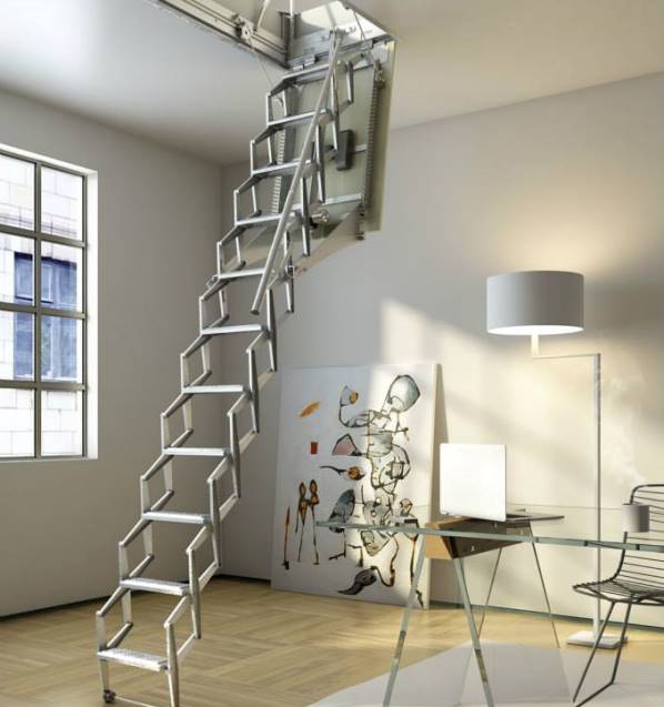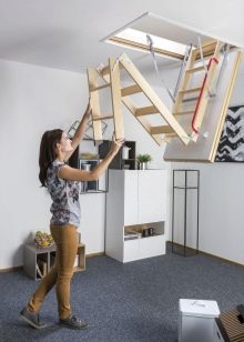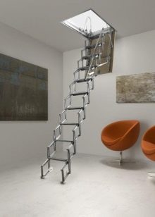 L'échelle pliante est divisée en trois groupes principaux - pliable, coulissant (sectionnel) et en ciseaux. Chacun d'eux se justifie, s'ils montent rarement au grenier ou s'il n'y a pas assez d'espace. La configuration de la structure en ciseaux est similaire à celle d'un collecteur de courant de tram ou d'un accordéon et, une fois pliée, elle provoque des associations avec des ressorts.En ce qui concerne les structures attenantes, c’est parmi celles-ci que l’escalier est l’option la moins chère.