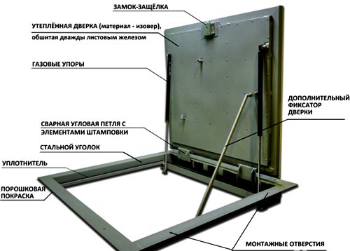 Il est très important d’avancer avec le matériau de la trappe: dans la plupart des cas, ils utilisent le même bois ou le même métal que pour les escaliers. Il doit être positionné de manière à ne pas toucher les poutres et les chevrons (et si le contact avec les poutres est toujours permis, il ne devrait en aucun cas être avec des chevrons). Avant le travail, il est nécessaire de faire des dessins et des schémas exacts. La taille de la trappe est choisie strictement sous la taille de l'ouverture, afin d'éliminer la courbure, la fissuration du plafond, la pénétration d'air froid dans la maison. Les salles de séjour séparées des greniers non chauffés doivent utiliser des couvertures isolantes.