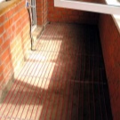Alles beginnt mit der Vorbereitung. Auf dem Boden unter den Fliesen breitet sich eine Imprägnierfolie aus, die den Boden vor Feuchtigkeit außen schützt. Weiter wird die obreshetka angeordnet. Statt eines Baumstamms wird ein fünf Zentimeter dicker Balken verwendet. Wenn Sie den Boden relativ zu dem alten Pflaster nicht stark anheben wollen, ist der Balken besser, eine niedrige Höhe zu verwenden. Perfekter quadratischer Träger 50 × 50 mm. Bars gestapelt alle 40-60 cm.