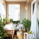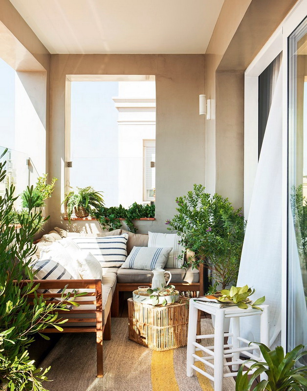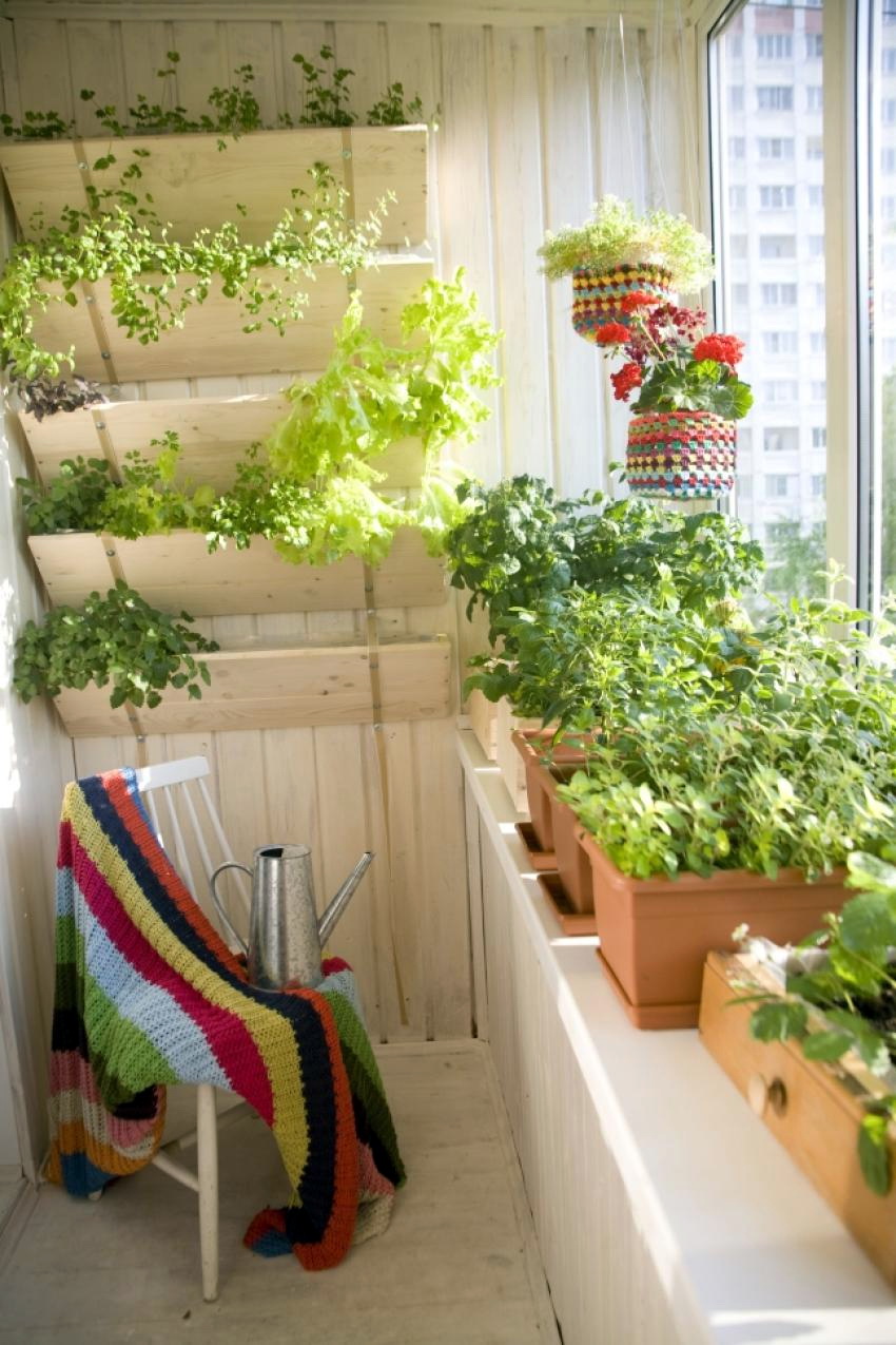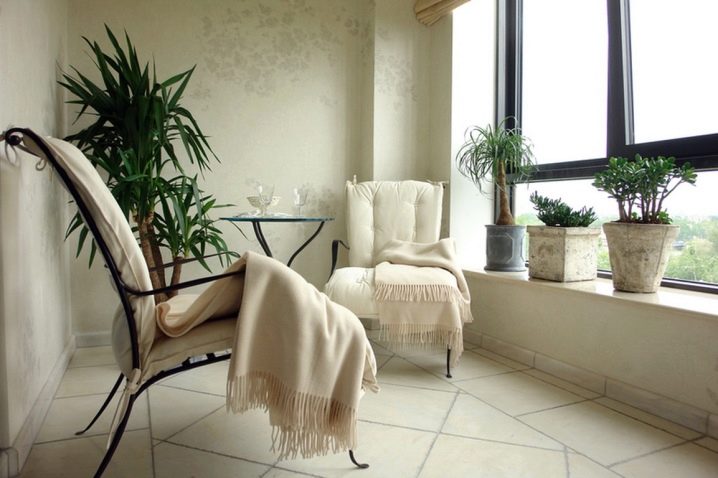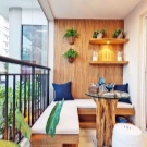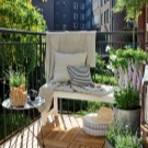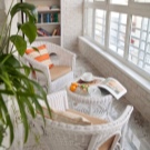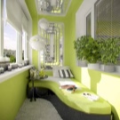 - Eine grüne Ecke ist eine großartige Lösung. Trotz der Größe des Raumes, versuchen Sie einen Platz auf dem Balkon für ein offenes Rack zu finden. Ordne dort Setzlinge oder Topfblumen an.Wenn der Platz groß ist, raten die Designer, es zu einem Erholungsgebiet zu machen: Korbmöbel aus Holz eignen sich perfekt für diesen Zweck.
