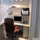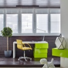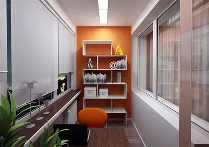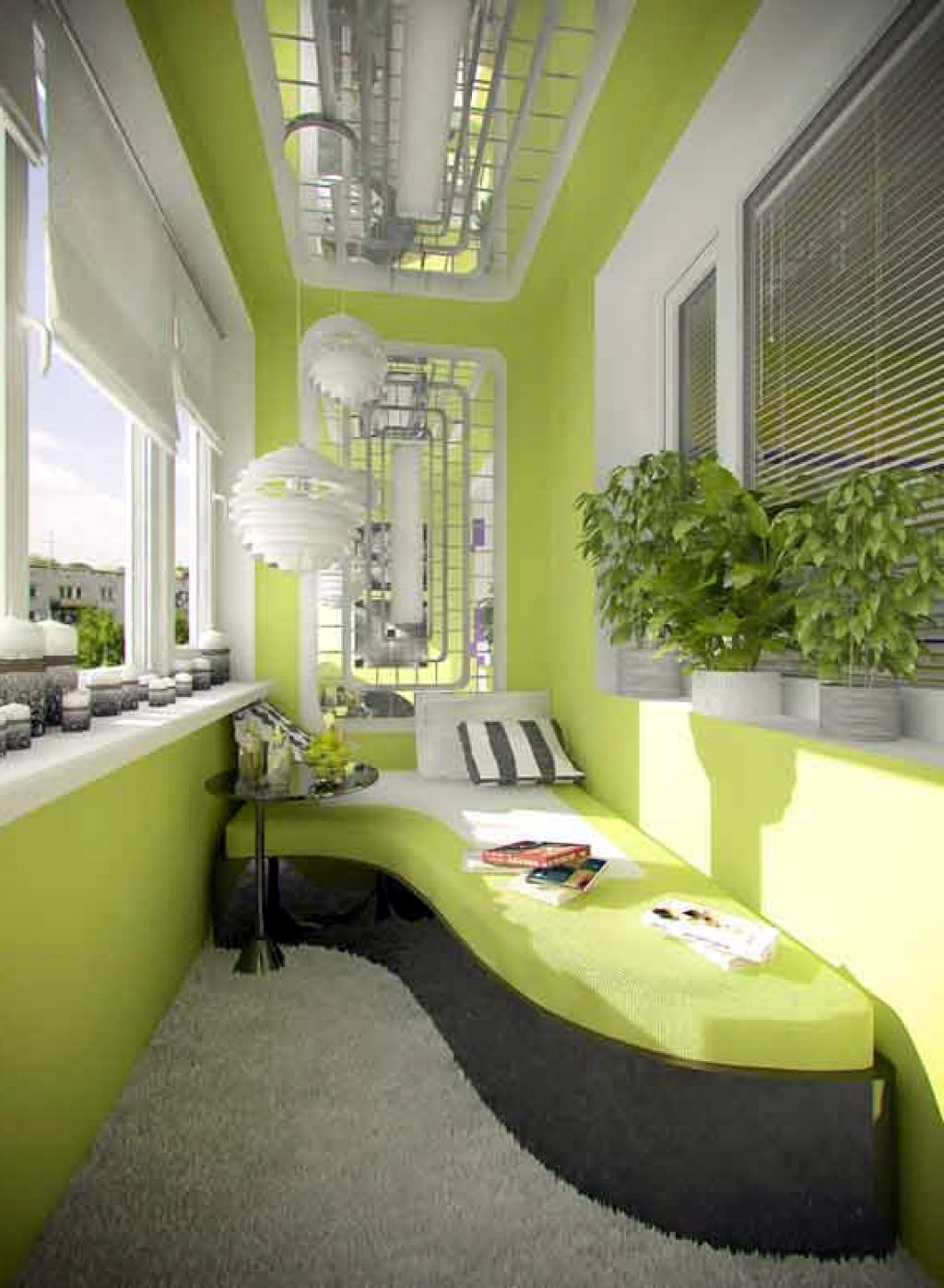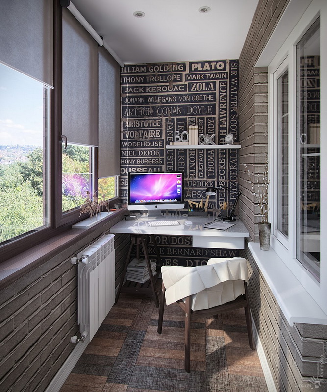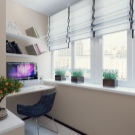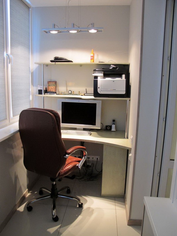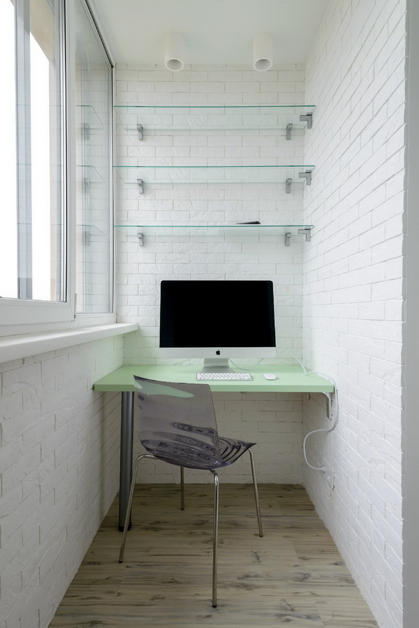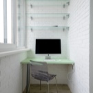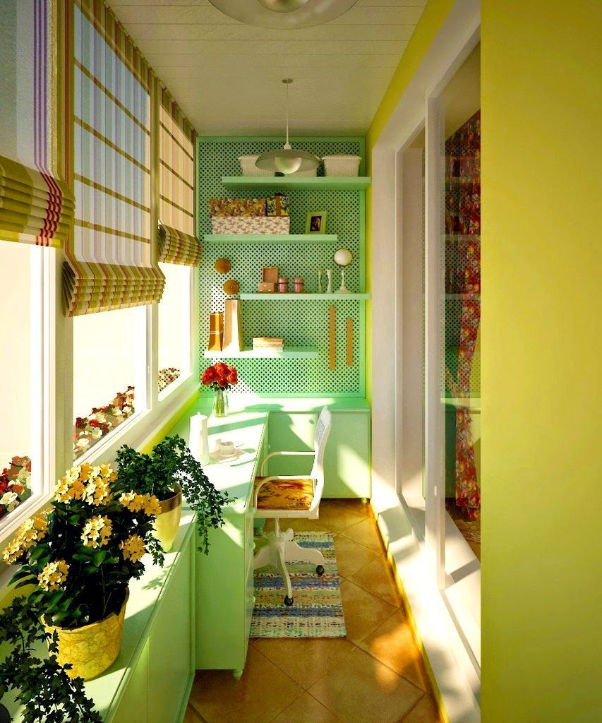 - Eine ausgezeichnete Lösung - ein Büro auf dem Balkon. Klare Linien, eine Kombination aus Weiß-, Hellgrün- und Gelbtönen sowie Holz und Kunststoff, passen sich der produktivsten Arbeit an.